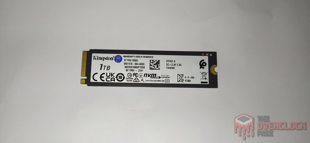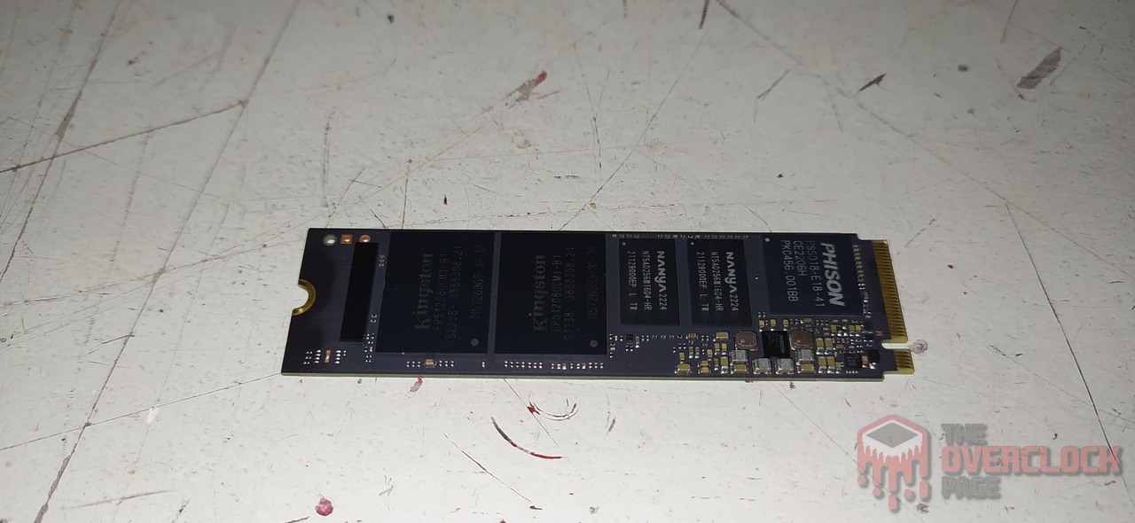 Com relação a seus circuitos integrados de armazenamento, o SSD de 1TB possui 2 chips Nand flash “FP51208UCM1-B1” que foram remarcadas pela Kingston. Tratam-se de Nands da fabricante norte-americana Micron, modelo B47R, sendo neste caso dies de 512Gb (64GiB) contendo 176-Layers de dados e um total de 195 gates, gerando uma array efficiency de 90,2%.