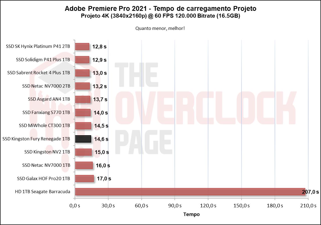 Ao utilizarmos o Premiere para carregarmos um projeto de mais de 16GB, o Kingston conseguiu um empate técnico com o SSD MiWhole CT300 que testamos anteriormente, que também foi um ótimo SSD do Aliexpress.