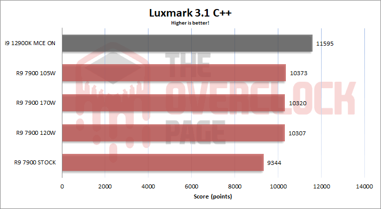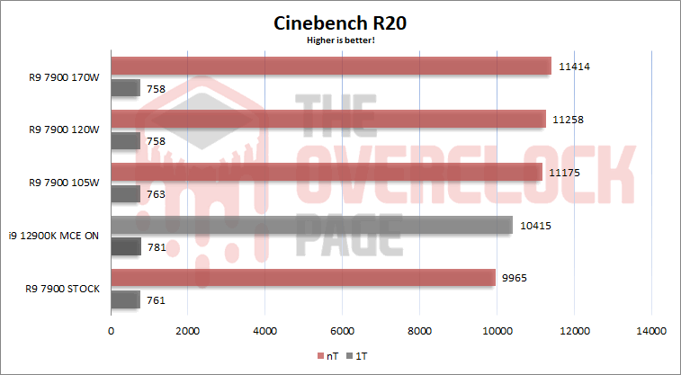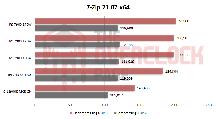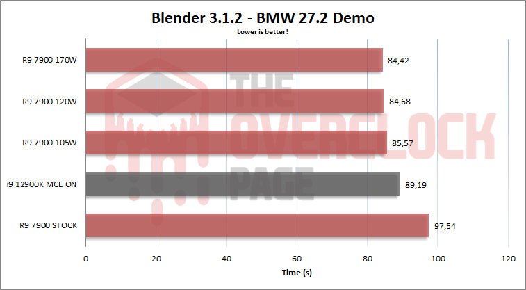 As for multi-thread (nT) performance, the increased TDP allowed for gains of up to 15% in some cases, such as Cinebench R20 MT and Blender. However, even in these tests, most of the performance improvement was achieved at 105W, with marginal gains scaling up to 170W. In comparison to the i9 12900K with MCE (Multi-Core Enhancement) enabled, it initially had a slight advantage over the R9 7900 at stock settings. However, this advantage disappeared once the TDP of the Ryzen processor was “unlocked” up to 105W.