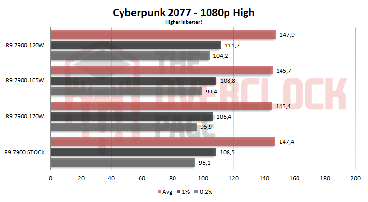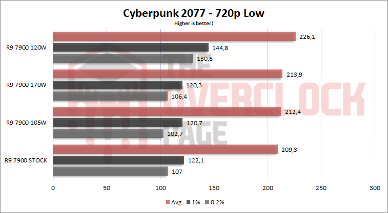 In terms of gaming performance, the R9 7900 performed well even at stock settings, gaining performance by increasing the TDP to 105W in CS:GO and 120W in SOTTR and Cyberpunk 2077. However, it’s important to observe that the performance gains were generally modest and more restricted to 720p resolution. This is something that will likely only interest those who need to squeeze every bit of performance from their system. In such cases, there are more efficient approaches, which will be discussed in another future article.