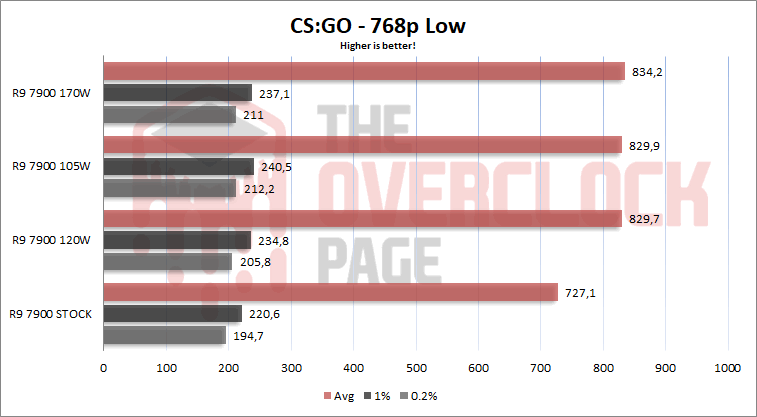 In CS:GO, the FPS Benchmark map was used with the game running at 768p, while the remaining settings were adjusted to match those of a professional player. Competitive players often sacrifice details in favor of achieving the highest possible frame rate to reduce input lag.