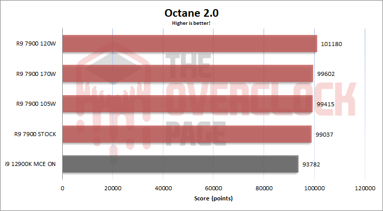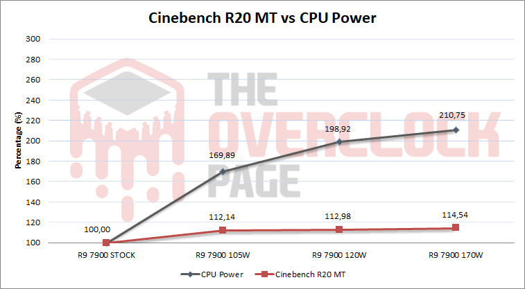 The Ryzen 9 7900 proved to be extremely efficient at its default TDP, ensuring that it should not pose a challenge even for the most basic motherboards. However, when increasing the TDP limits, power consumption increased by 70% at 105W and nearly doubled at 120W. However, this increase in power consumption did not translate into performance gains in the same proportion, with only a 13% increase for double the power consumption.