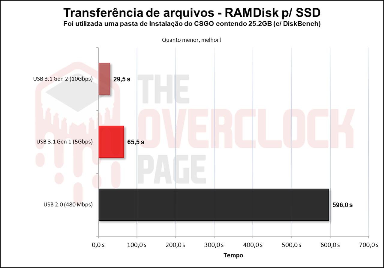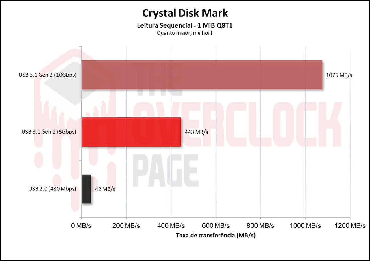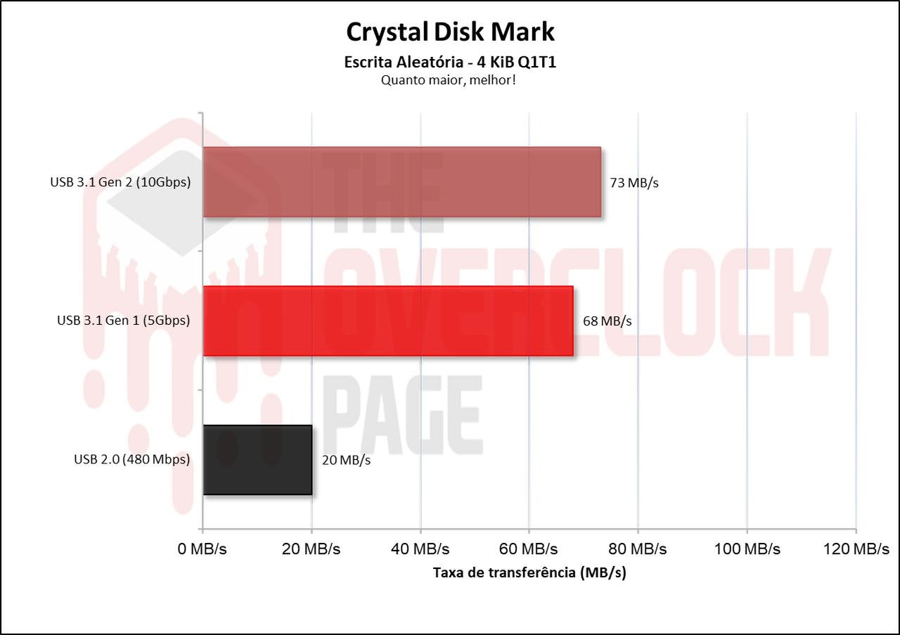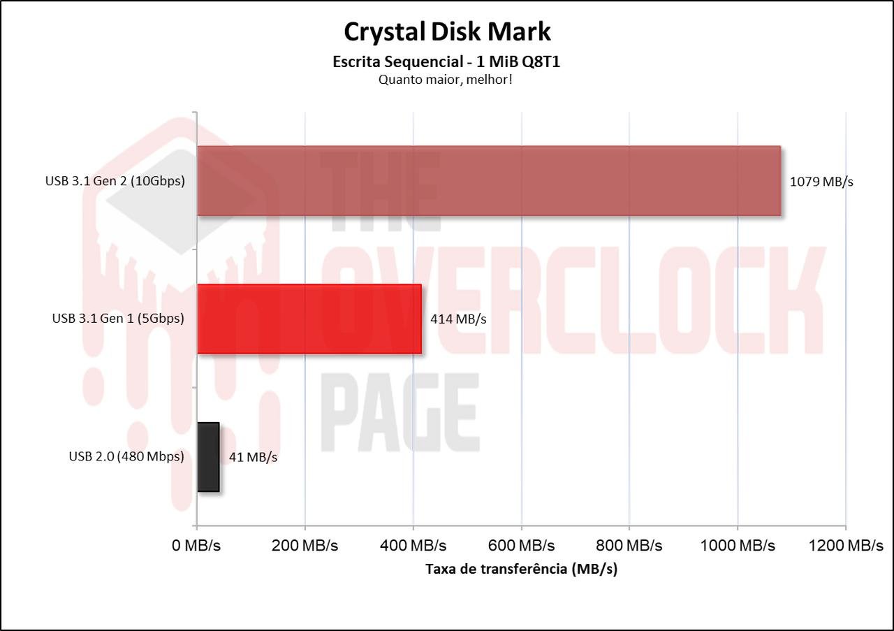 Como estamos testando uma case externa USB 3.1 10Gbps, e muito das máquinas e notebooks hoje já possui USBs capaz de atingir esse barramento, também foram incluídos resultados de comparação a enclosure conectado em uma entrada USB 3.0 (5Gbps) e em uma entrada USB 2.0 (480Mbps) para aqueles que não possuem tais conectores.