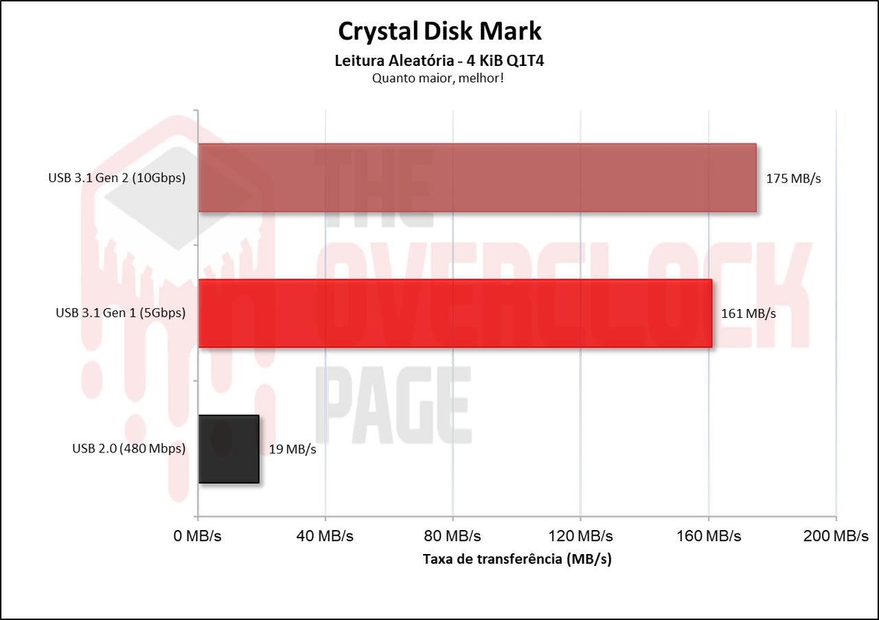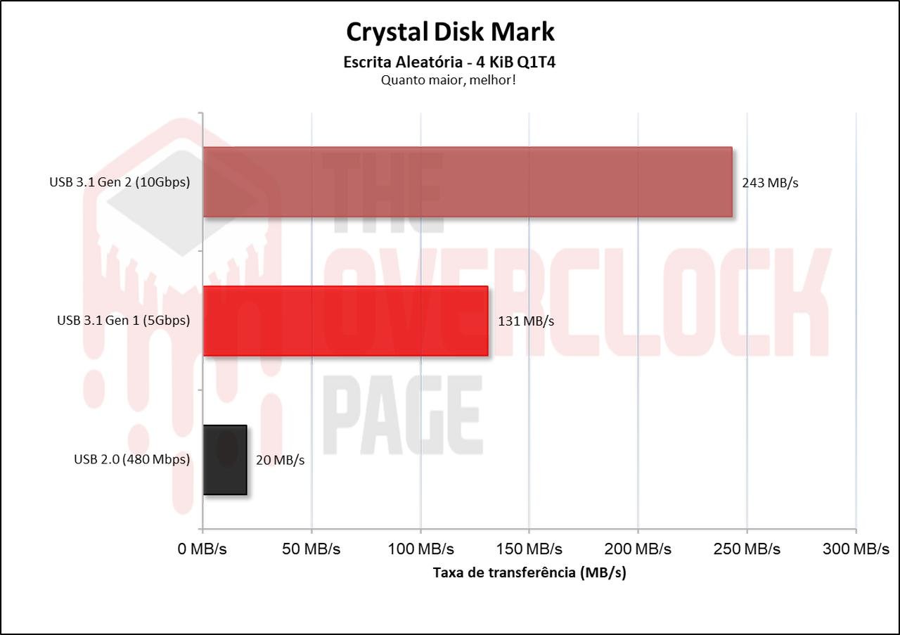 Suas velocidades aleatórias em QD4 foram também novamente similares no quesito de leitura quando conectadas em 10Gbps e 5Gbps, tendo uma maior diferença em sua escrita. Novamente vemos as portas USB 2.0 destruindo o desempenho do SSD Externo.