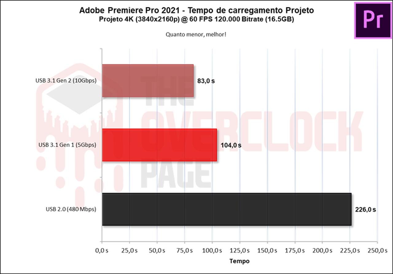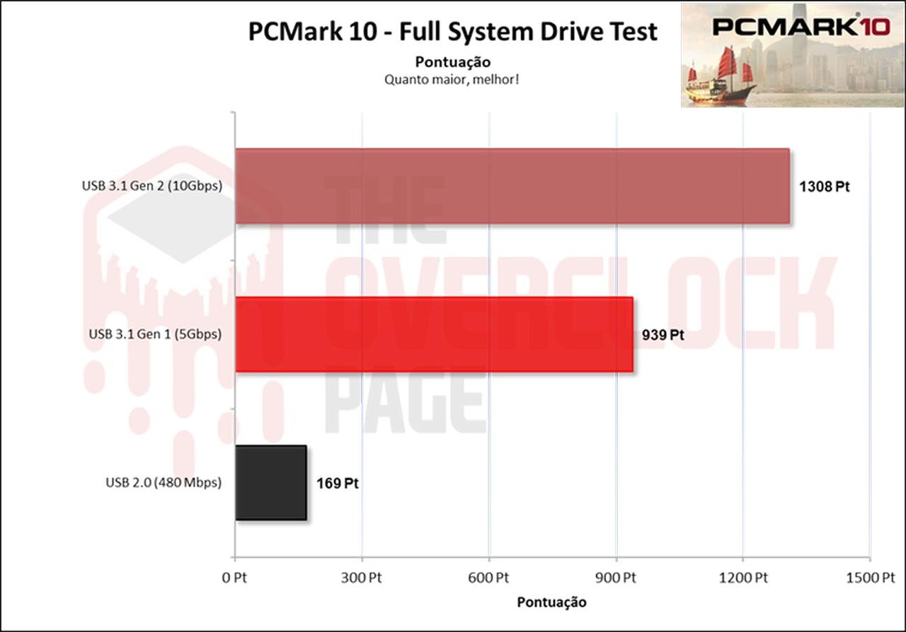 Este mesmo cenário se repetiu neste benchmark com foco em produtividade, aonde houve sim uma queda ao sairmos da USB de 10 Gbps para 5 Gbps, mas não foi tão gigante quanto a da porta USB 2.0.