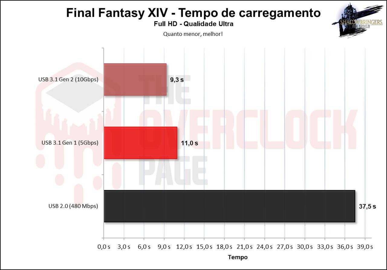 Vemos que até mesmo neste caso, um benchmark que representa demais a realidade, houve uma diferença ENORME quando usamos a enclosure em uma porta USB 2.0, portanto para aqueles que queiram usar um SSD externo para deixar games armazenados, evitem entradas USB 2.0.