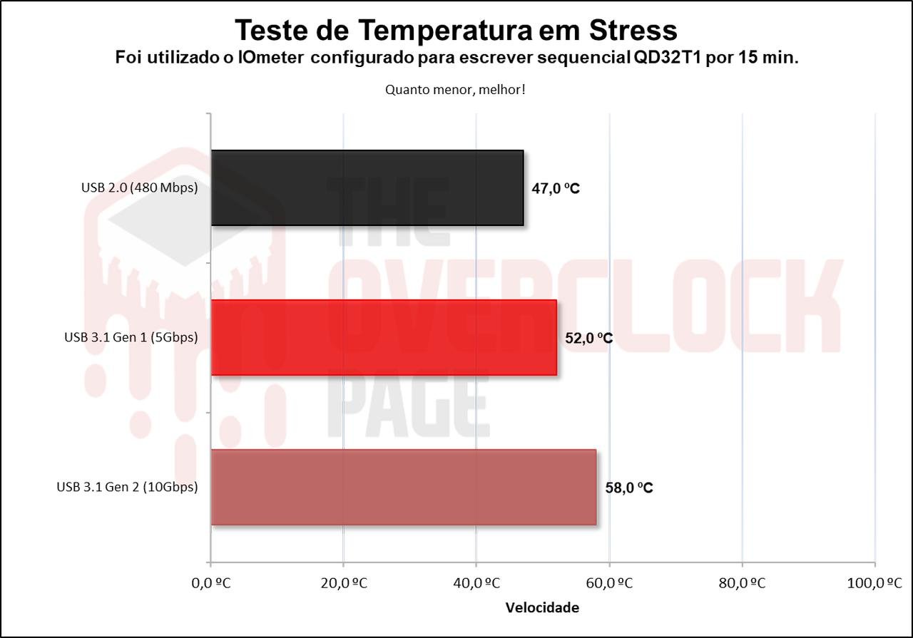 Durante o teste de temperatura, iniciando com a enclosure na porta de 10Gbps vemos que o SSD não chega a sofrer throttling, mas ficou próximo, pois sua temperatura estava acima dos 70?°C e sua temperatura na sua carcaça foi de 58?°C, o que é alarmante, apenas desconfortável de se segurar, pois, pode queimar a mão. Já ao testarmos com outras portas, devido à menor largura de banda sua temperatura também caiu.