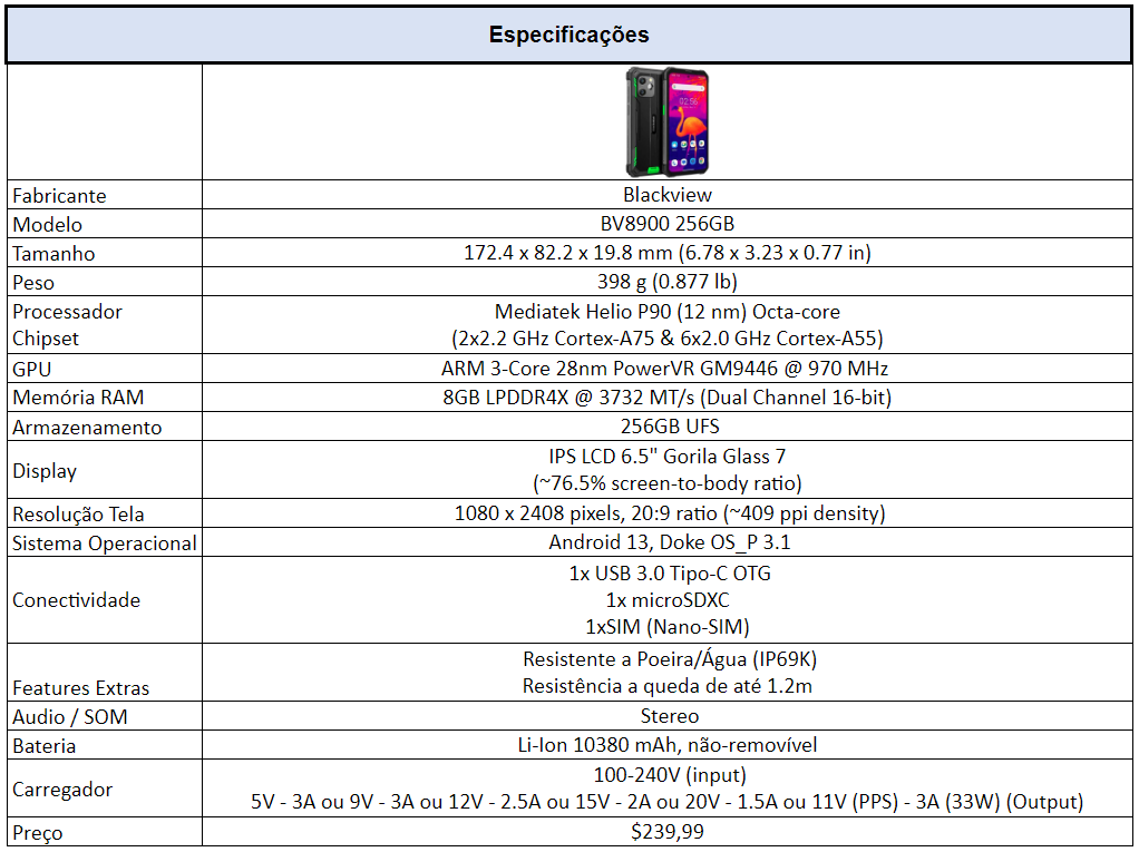 O dispositivo dessa análise é o telefone Blackview BV8900, onde a versão que recebemos é equipada com processador/chipset MediaTek Helio P90 e 8GB LPDDR4X de memória RAM. Este telefone está disponível apenas nesta versão de armazenamento, de 256GB UFS, que será testada aqui.
