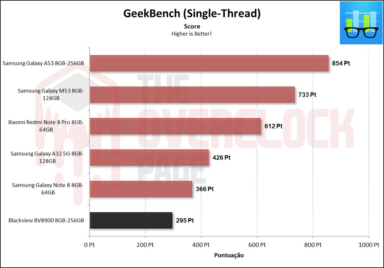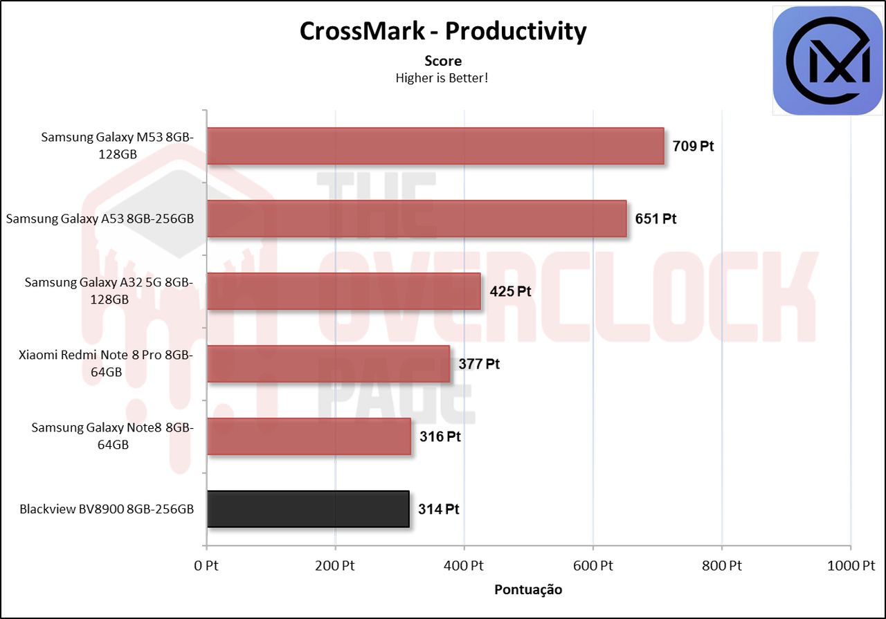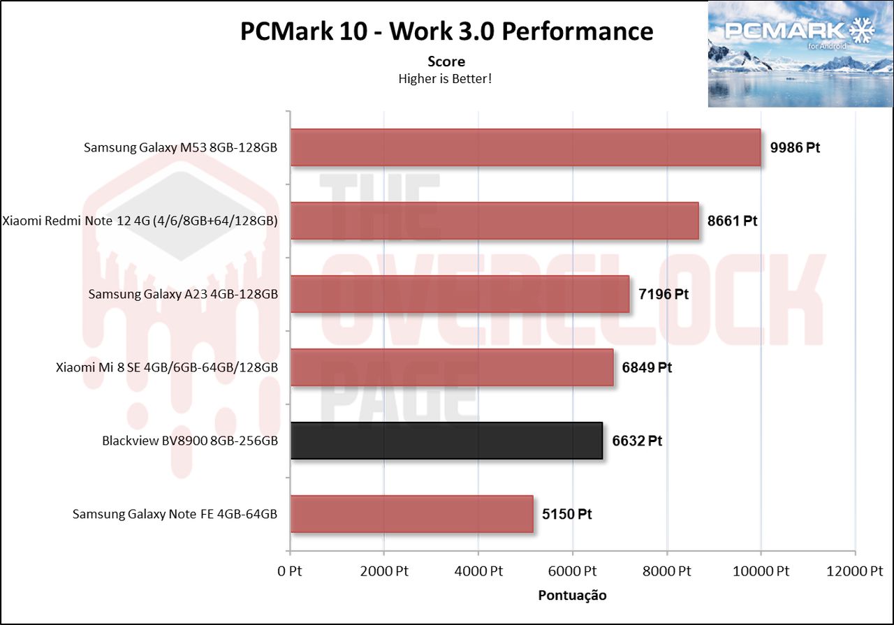Neste benchmark de produtividade, o Blackview BV8900 apresentou um empate técnico com o Xiaomi Mi 8 cujo possui diferentes revisões que tem como diferença a quantidade de armazenamento e a sua memória RAM.