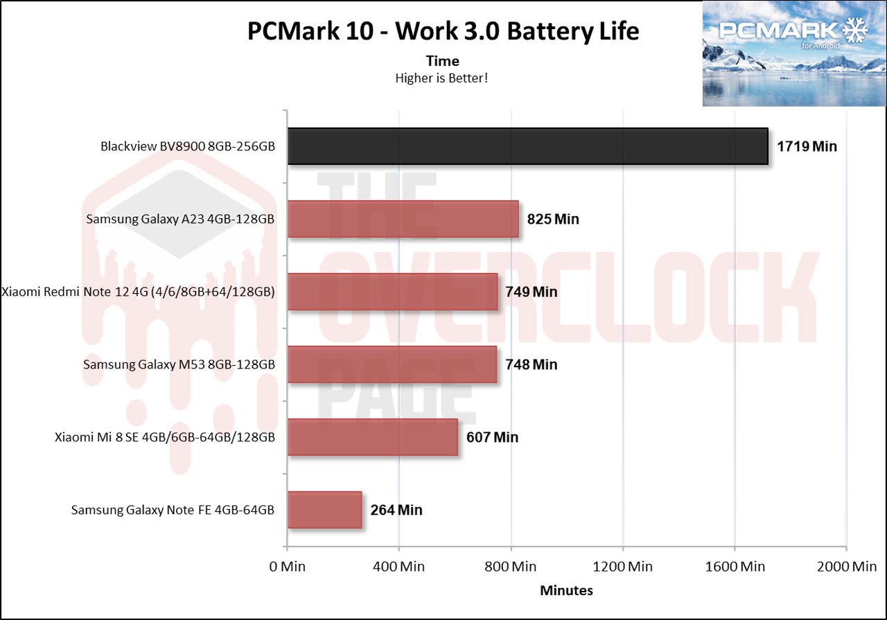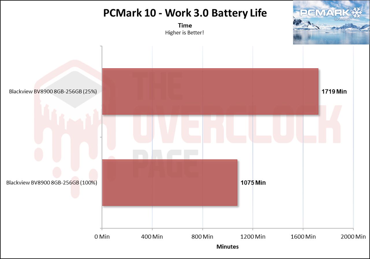 Neste outro benchmark é usada a mesma suite de testes do Work 3.0, porém, de forma ininterrupta, aonde o dispositivo precisa estar com 100% de bateria de carga e o teste termina quando ela chega nos 20%. Foram testados 2 parâmetros, um com o brilho em cerca de 20 à 25% de intensidade, e outro no máximo.