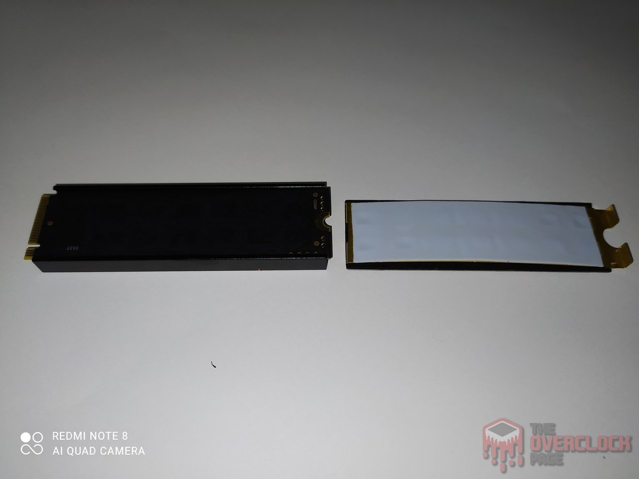 Ao removermos o dissipador vemos que ele possui como mencionado 2 thermal-pads em ambos os lados para favorecer o arrefecimento do calor. Fora isso vemos o PCB do SSD com os componentes que mencionamos acima.