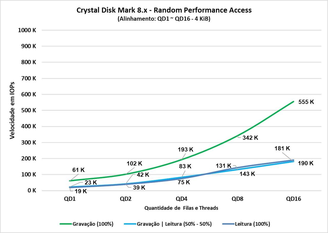 Neste teste, foram feitas 3 configurações de acessos entre diversas configurações de queue depth desde QD1, que representam um uso do dia a dia, quanto QD16, que já se torna bem surreal, mais comparável com ambientes virtualizados.