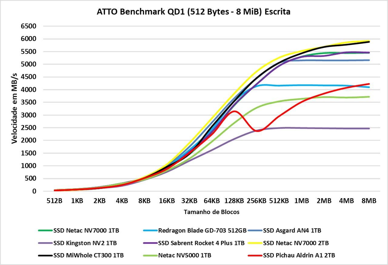 Realizamos um teste utilizando o ATTO para observar a velocidade dos SSDs em determinados tamanhos de blocos diferentes. Neste benchmark, foi configurado da seguinte forma: