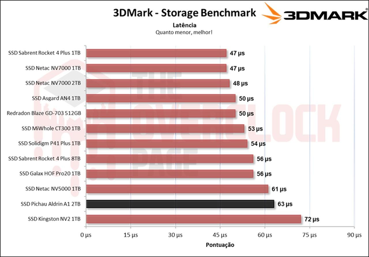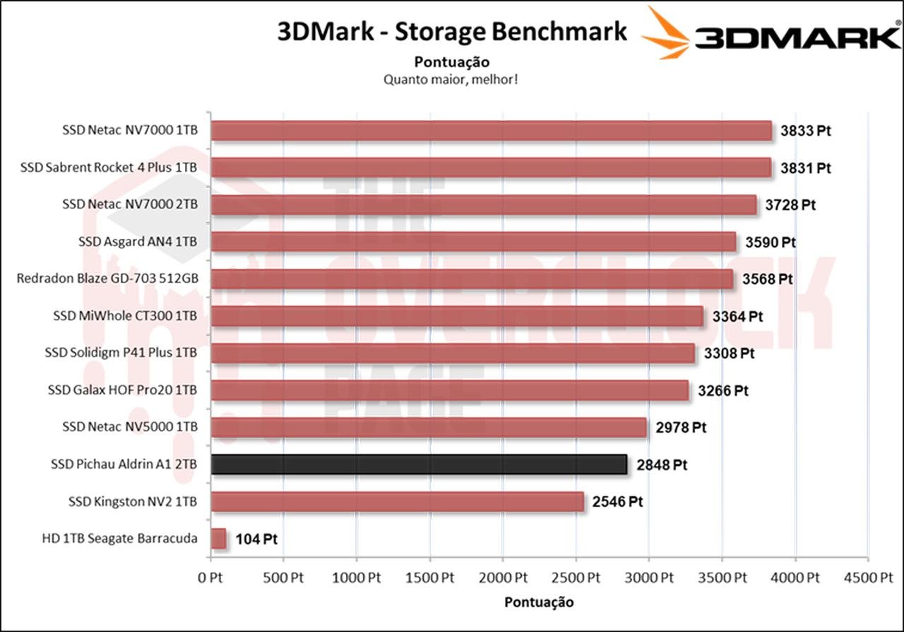 Vemos que neste benchmark, com traces mais realistas e tradicionais de uso cotidiano, o Pichau Aldrin teve um desempenho razoável, ficando próximo de um SSD Netac NV5000 que possui DRAM Cache e um controlador Phison E16, e ficou acima de SSDs como o Kingston NV2.