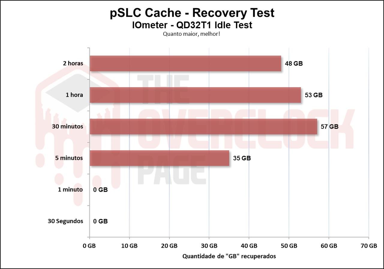 Realizamos também um teste para ver quanto tempo o SSD levaria para recuperar parte de seu Buffer e no decorrer da nossa bateria de testes, que dura de 30 segundos até 2 horas em idle, utilizando o TRIM e gargabe collection vs TRIM/GC não utilizados. Ao testarmos sem usar o TRIM/GC podemos observar que ele conseguiu recuperar cerca de 35GB à 57GB em cerca de 5 minutos à 30 minutos em idle, infelizmente, mesmo após 2 horas em idle ele não conseguiu recuperar mais do que isto. Entretanto, foi um resultado ótimo, considerando este cenário irrealístico e não proporcional.