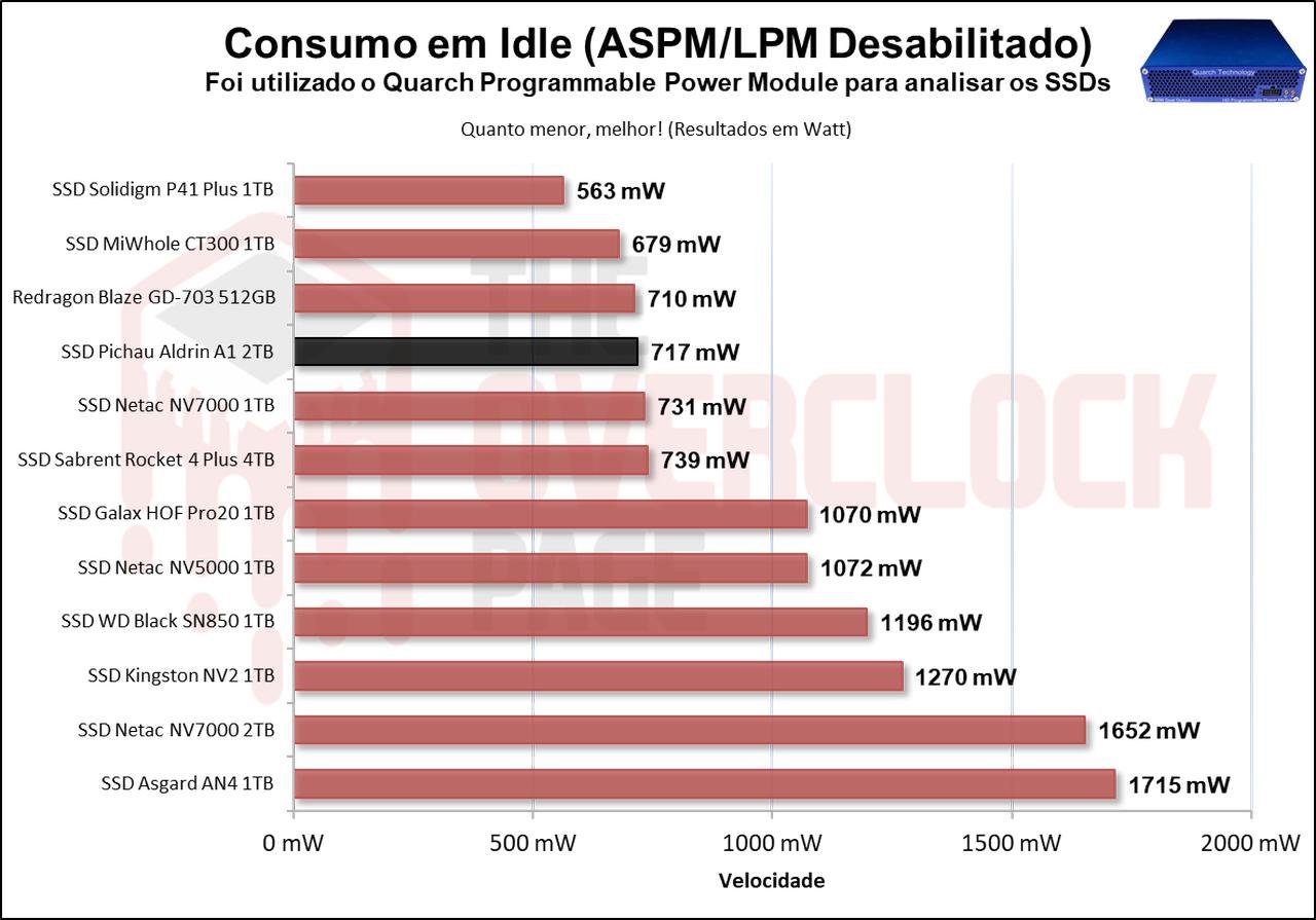 Por último e mais importante, teste em Idle, sendo o cenário em que a esmagadora maioria dos SSDs se encontram no uso do dia a dia ou cotidiano, e mesmo aqui ele não deixa a desejar, ele conseguiu um excelente resultado ficando abaixo dos 720mW, ficando levemente acima do Blaze GD-703 que havíamos testado anteriormente.