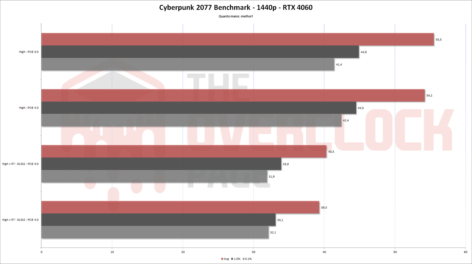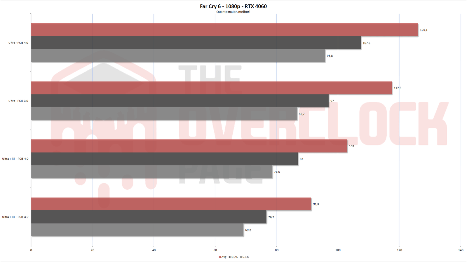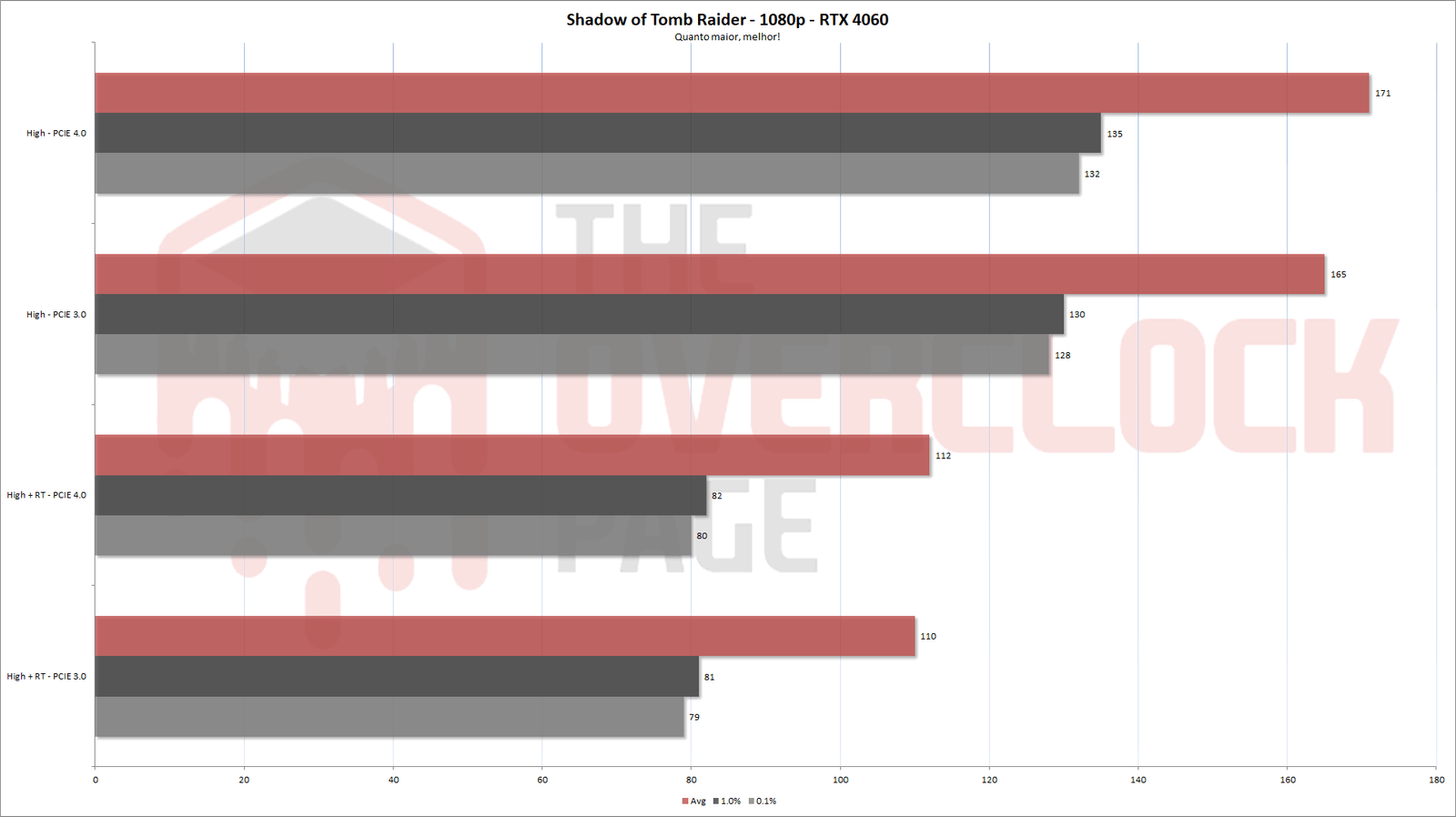 Outra coisa que foi testada é o impacto do PCI-E 3.0 no desempenho da placa, afinal existe muito hardware sem suporte a PCI-E 4.0 no mercado, o que inclui placas-mãe B450 e CPUs Ryzen 5000G, então, por essa se tratar da opção de entrada para as RTX 40 e também por ela estar limitada a oito pistas, torna-se relevante esse teste.