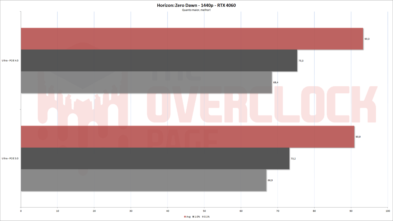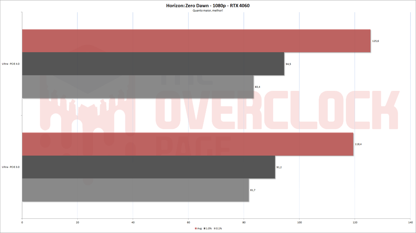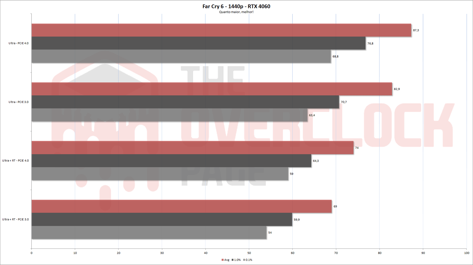 Outra coisa que foi testada é o impacto do PCI-E 3.0 no desempenho da placa, afinal existe muito hardware sem suporte a PCI-E 4.0 no mercado, o que inclui placas-mãe B450 e CPUs Ryzen 5000G, então, por essa se tratar da opção de entrada para as RTX 40 e também por ela estar limitada a oito pistas, torna-se relevante esse teste.