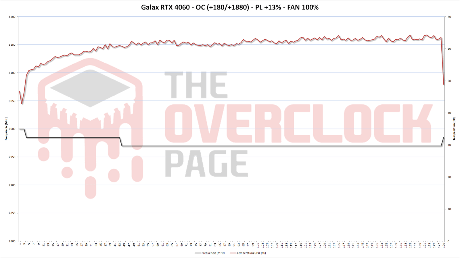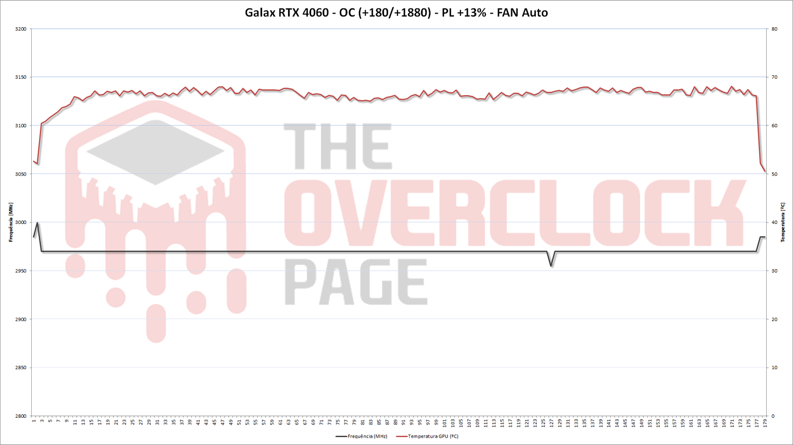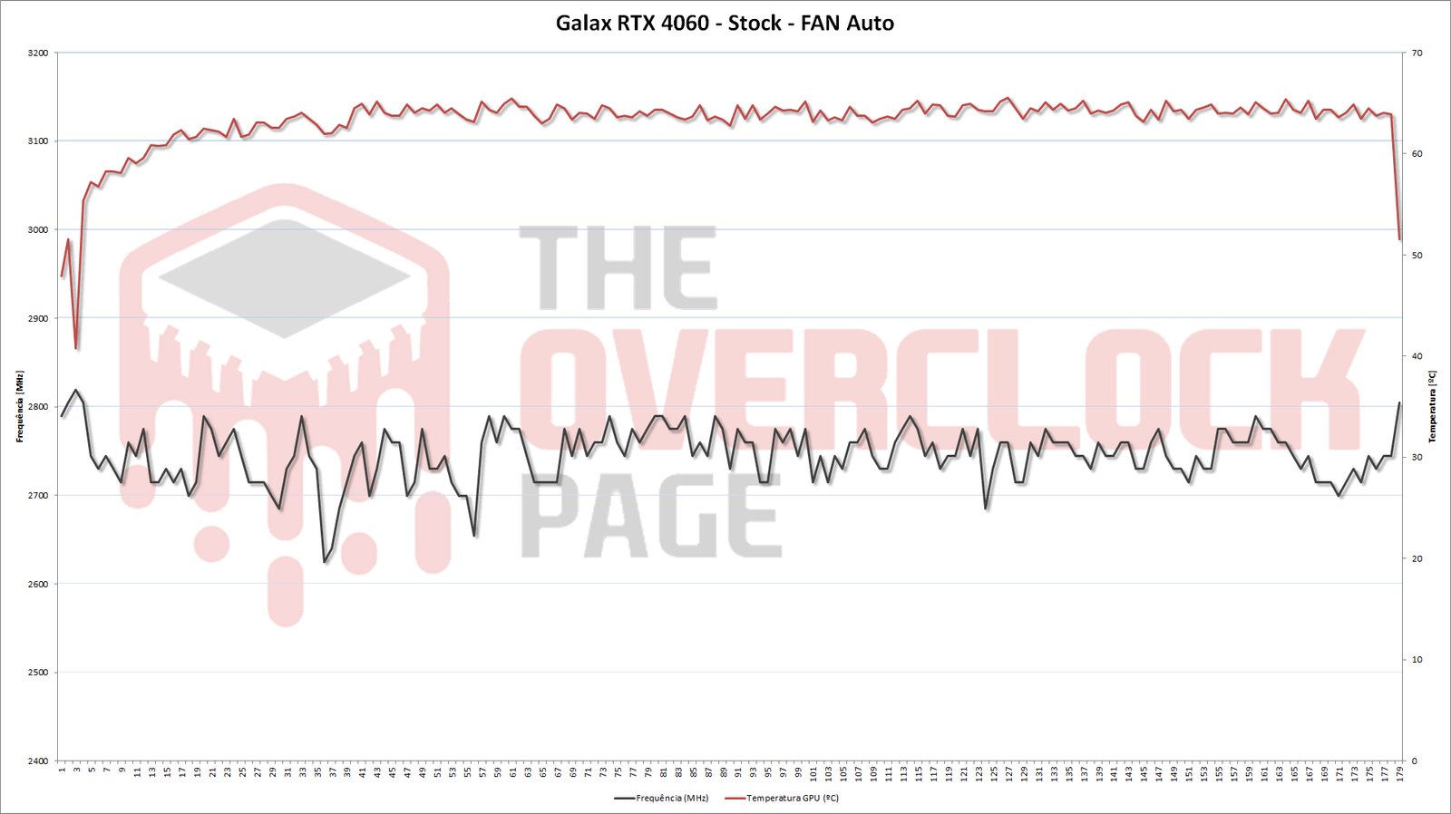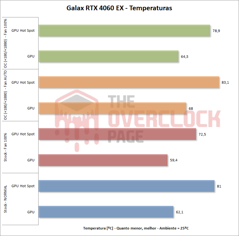 A Galax RTX 4060 se mostrou uma placa extremamente decente do ponto de vista do sistema de refrigeração, o qual apresentou excelente desempenho, no caso, em stock com o fan na configuração automática, a temperatura da GPU ficou nos 62,1?°C enquanto o Hot Spot não excedeu os 81?°C, enquanto com o overclock e fans em auto, foram reportados 68?°C e 83,1?°C, o que garante que dentro do case ou em dias quentes, tudo continuará tranquilo nesse sentido