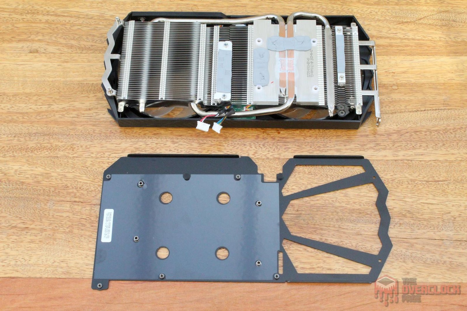 A respeito do dissipador utilizado, o fabricante optou por um design usando dois heatpipes de contato direto com a GPU, onde essa base também faz a dissipação de calor das memórias, cujo contato é feito usando “thermal pads”. Sobre o “backplate”, ele é de metal e não possui “thermal pads”, portanto, tem apenas função estética e de dar maior rigidez a placa.