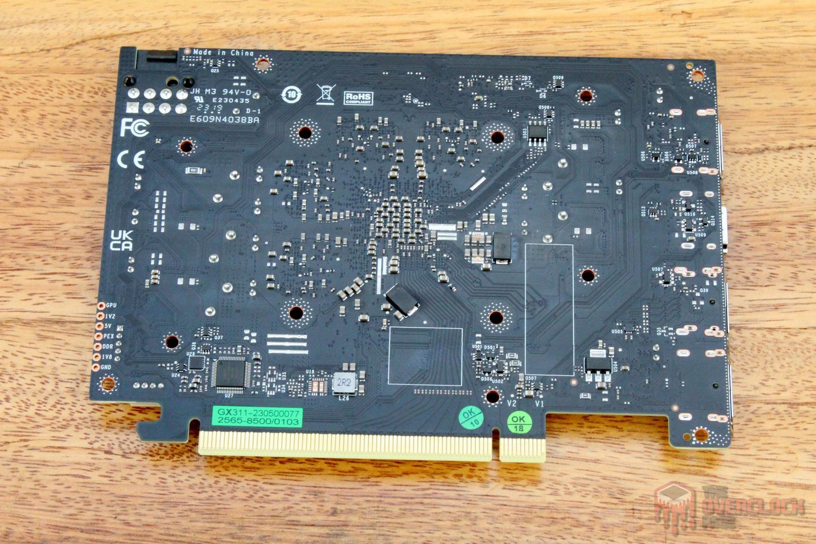 Sobre o PCB, ele é bastante compacto e na parte da frente é possível ver a GPU AD107 com os quatro chips de memória GDDR6, o VRM de quatro fases para a GPU, uma fase para as memórias e o conector de força, enquanto na parte de trás, encontram-se logo atrás do chip gráfico alguns capacitores responsáveis pela filtragem da tensão de saída do VRM e controladora RGB.