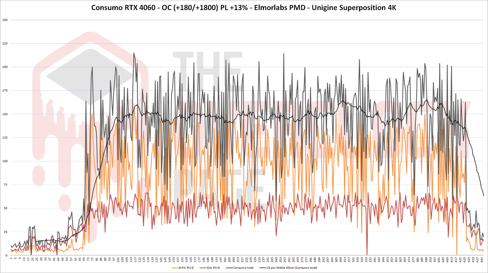 Ao fazer overclock, o consumo médio foi de 146W, um aumento de 14.4% para um incremento de 13% no Power Limit.