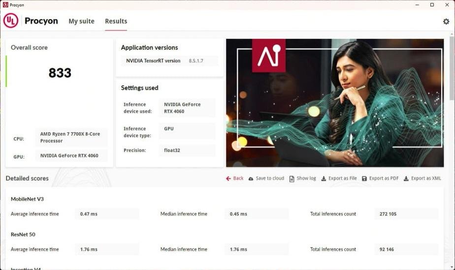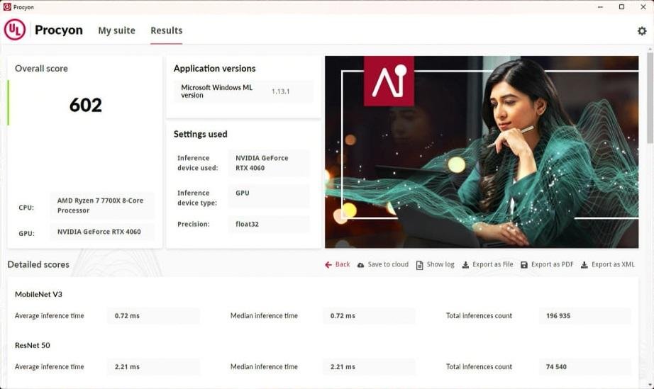 - No UL Procyon, foi utilizado o AI benchmark, que contém uma série de benchmarks de inferência de IA.
