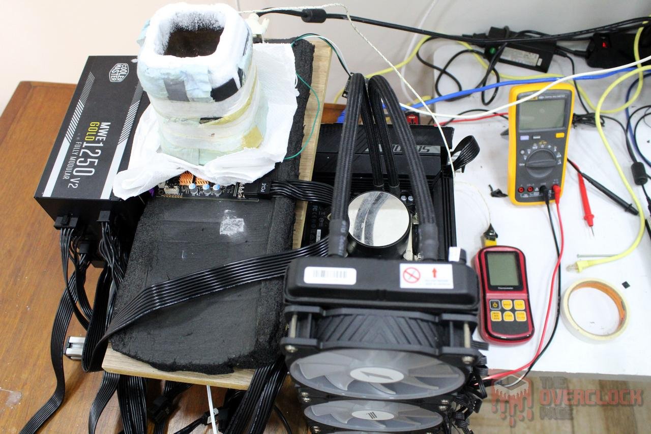 O próximo passo foi testar com refrigeração a água, onde foi utilizado um loop custom com um radiador de 360mm equipado com três fans de mais de 100cfm, um bloco Freezemod RGB e Thermal Grizzly Conductonaut.