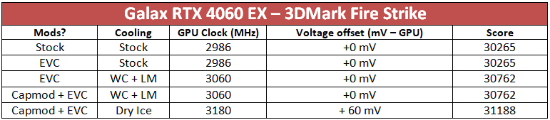 To summarize the article, here are tables with the maximum frequencies achieved both in Fire Strike and GPUPI, along with the cooling method and voltage used in each case.