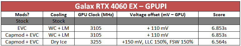 Regarding the results obtained, the AD107 GPU virtually does not scale with additional voltage at ambient temperature, showing only minimal gains in GPUPI, even when using a custom water cooling setup with liquid metal thermal compound.