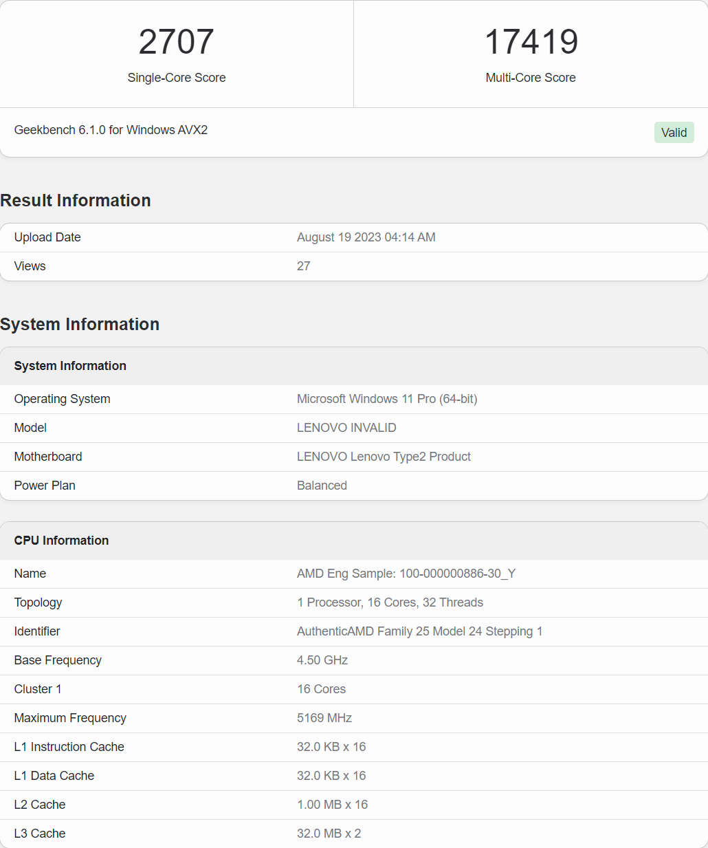 O resultado foi de 2707 pontos em “Single-Core” e 17419 em “Multi-Core”, o que está abaixo de um Ryzen 9 7950X, porém, é necessário lembrar que essa é uma amostra de engenharia rodando em uma placa-mãe Lenovo desconhecida, portanto, esses números podem melhorar até o lançamento.