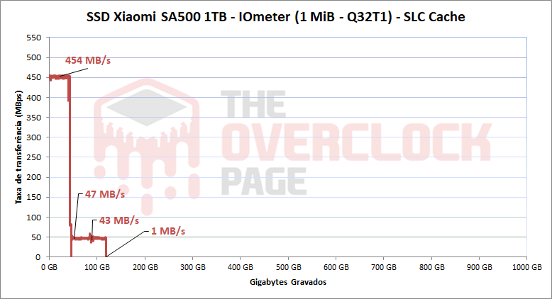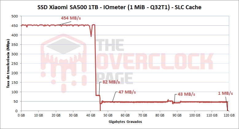 Através do IOmeter, podemos ter uma ideia do volume de SLC cache deste SSD, já que o fabricante muita vezes não informa este valor. Pelos testes que realizamos, foi possível constatar que ele possui um volume de pSLC Cache que aparenta ser dinâmico, de cerca de 42GB, ele conseguiu manter velocidade média de ~ 450MB/s até o fim do buffer. E logo em seguida sua velocidade média caiu para cerca de 80MB/s na sua forma nativa TLC.