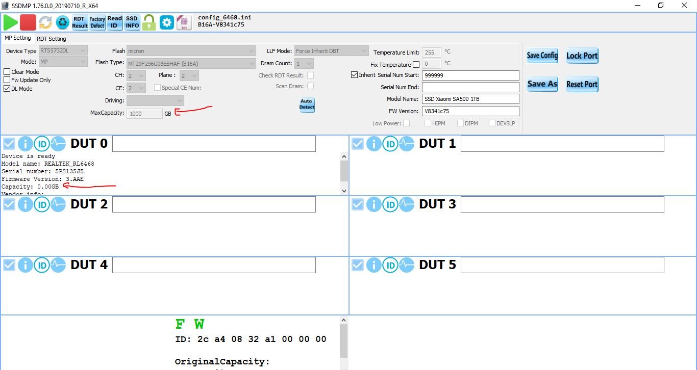 Agora na imagem abaixo vemos que a “MaxCapacity“ele mostra como “1000GB” porém no “DUT 0” (Device Under Test) ele mostra 0GB devido identificar algo de errado que o fabricante fez.