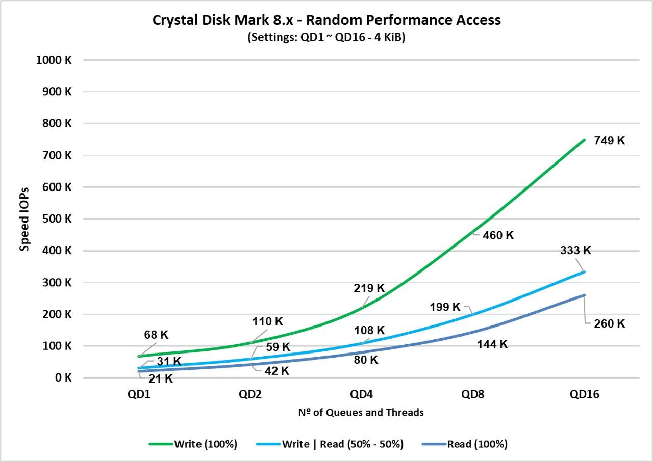 In this test, three access configurations were performed across various queue depth settings, ranging from QD1, representing everyday usage, to QD16, which becomes quite demanding and more comparable to virtualized environments.