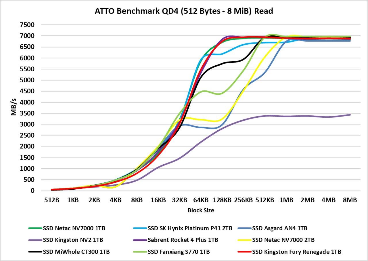 We conducted a test using ATTO to observe the SSD speeds at various block sizes. This benchmark was configured as follows: