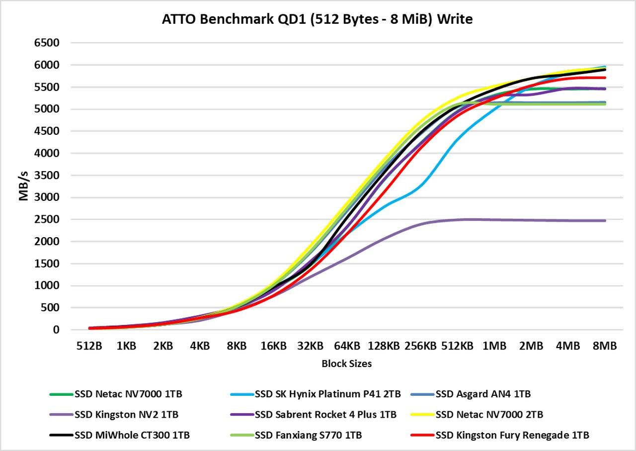 In the case of write tests, although the SSD showed good results for certain block sizes, such as 8KB to 64KB, it falls behind other SSDs in the comparison. However, its write performance returns to its previous level afterward.