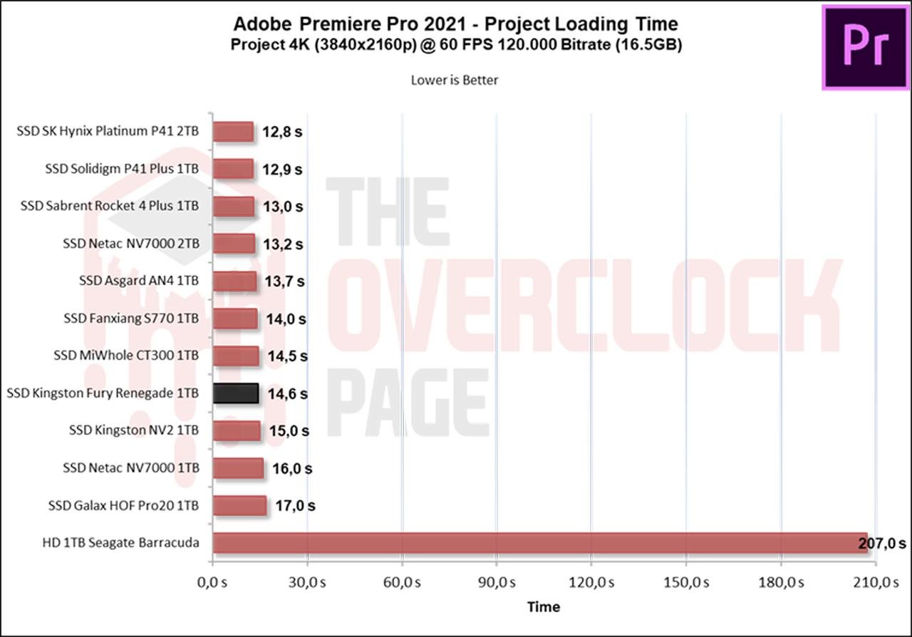 When using Premiere to load a project of over 16GB, the Kingston SSD achieved a technical tie with the previously tested MiWhole CT300 SSD, which was also a great AliExpress SSD.