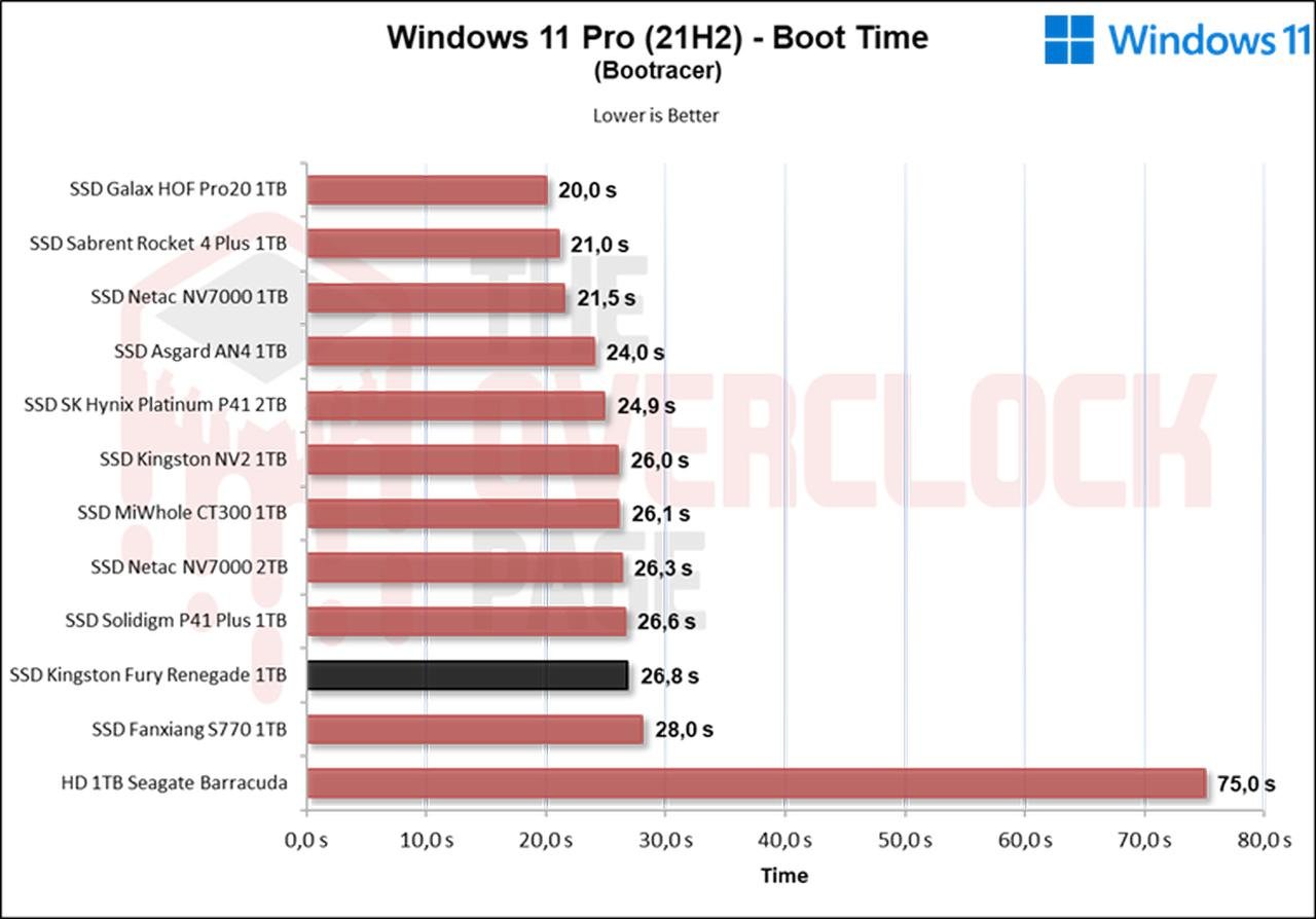 In this test, it covers the boot time until the loading of the latest OS drivers. In this case, a clean installation is done with only OS drivers such as Network, Wireless + Bluetooth, Audio, Nvidia drivers, PCH, among others. We can observe that the Kingston SSD once again achieved a technical tie with the Solidigm P41 Plus in this scenario.