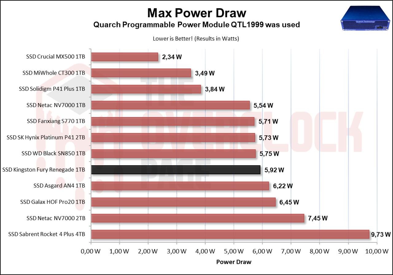 Regarding its maximum power consumption, the Kingston SSD ended up being close to the 1TB SN850, being only 150mW higher. This can be considered an acceptable result, especially considering it’s a 1TB drive. Additionally, it remained well below the maximum allowed power consumption of 8.8W according to the PS0 power state.
