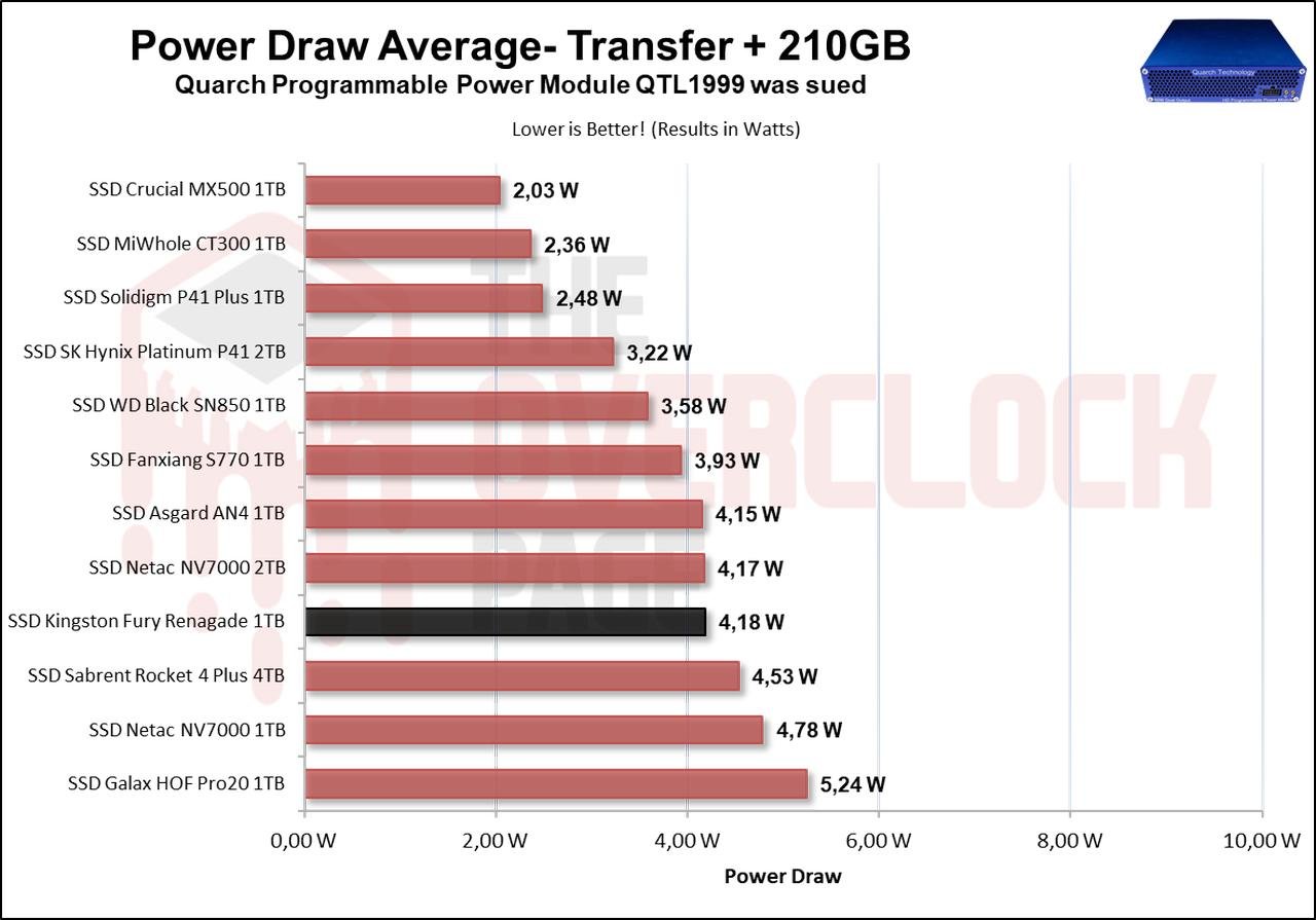 In terms of average power consumption, the Kingston SSD showed a consumption of 4.18W, which is almost identical to the 2TB Netac NV7000 we tested. This is a positive result for a 1TB SSD.