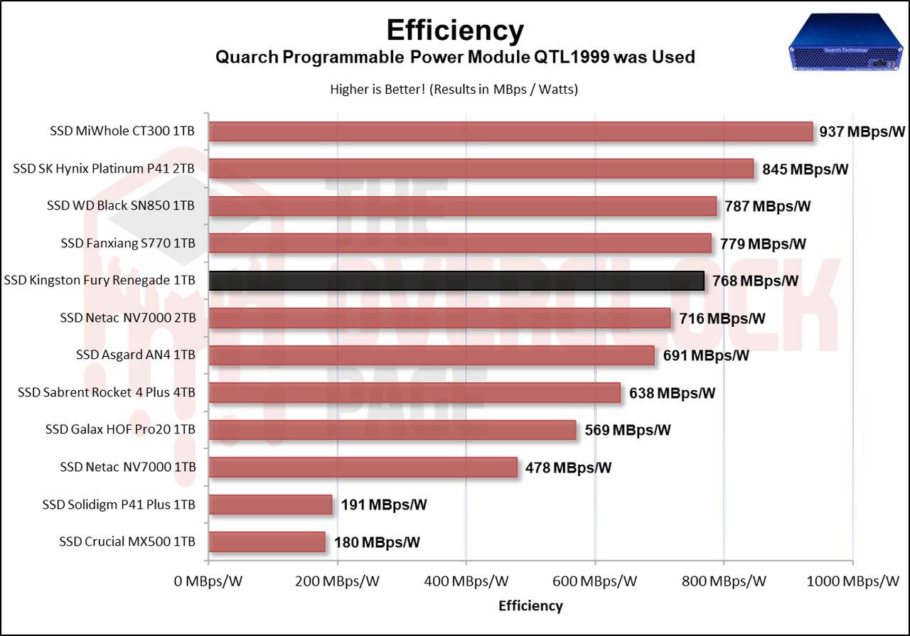 In terms of efficiency, the Kingston SSD performs quite well for a drive with the Phison E18 controller and Micron B47R NANDs. It only falls behind SSDs with proprietary controllers such as those from Western Digital or SK Hynix, and of course, the Maxiotech SSD. However, it’s important to note that the Maxiotech SSD has a controller with 4 communication channels compared to the 8 channels in the Phison controller used in the Kingston SSD.