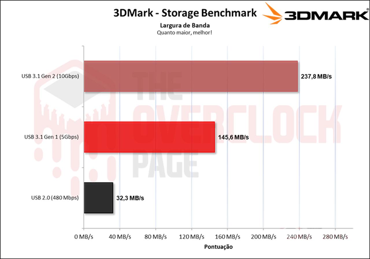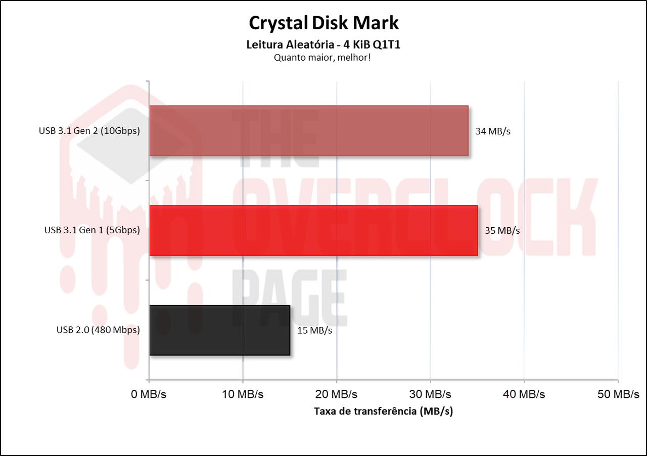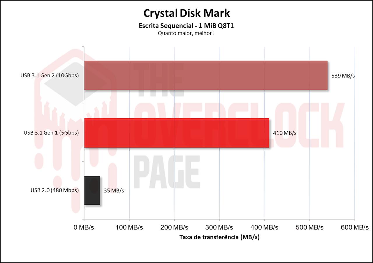 Como estamos testando uma case externa USB 3.1 10Gbps e muitas máquinas já possuem USBs capazem de atingir esse barramento, também foram incluídos resultados de comparação, com a enclosure conectada em uma entrada USB 3.0 (5Gbps) e USB 2.0 (480Mbps), para aqueles que não possuem tais conectores.