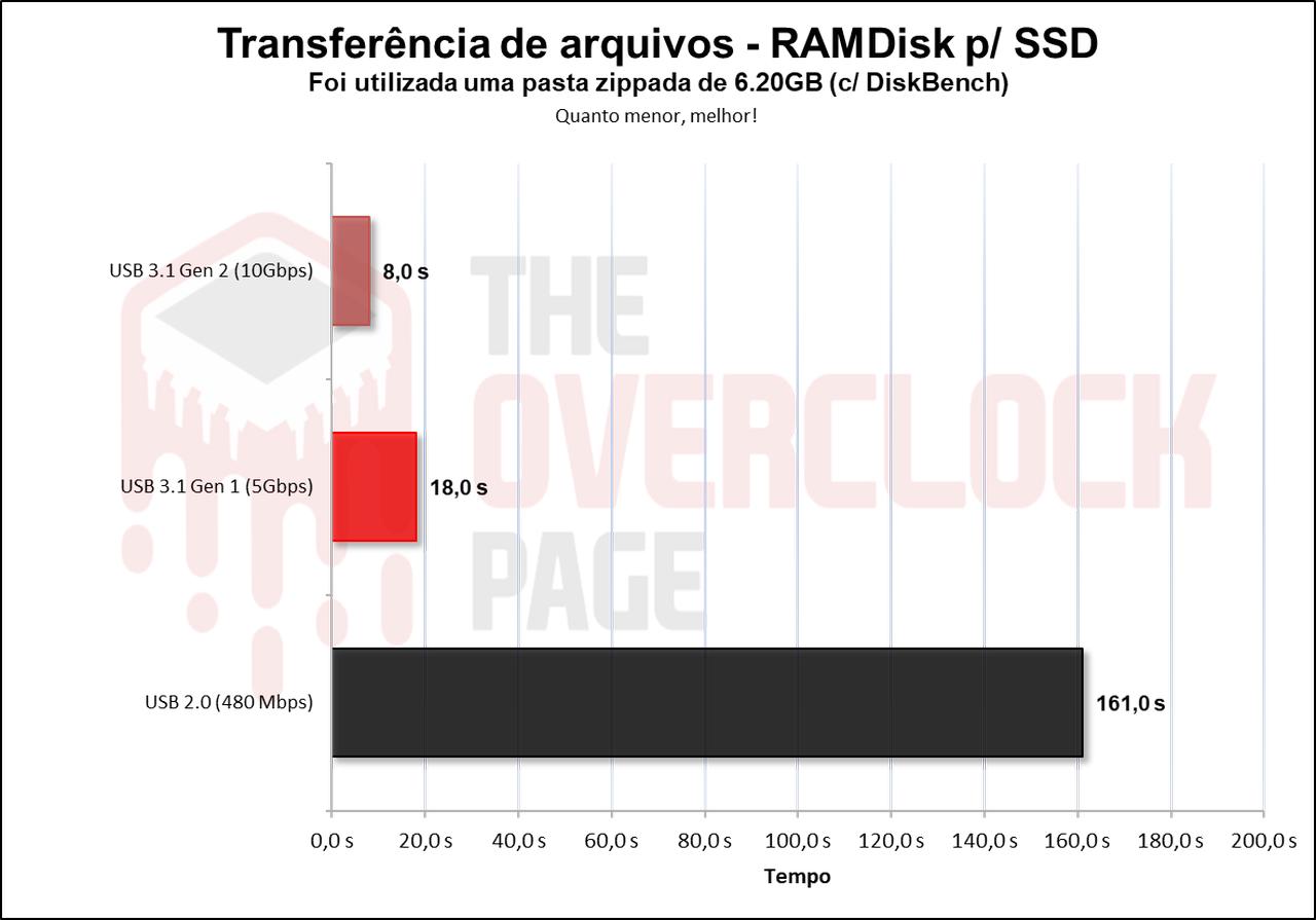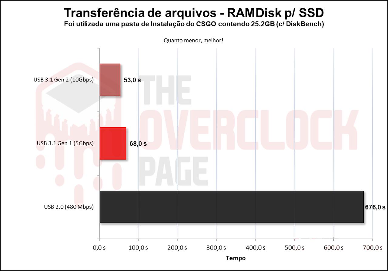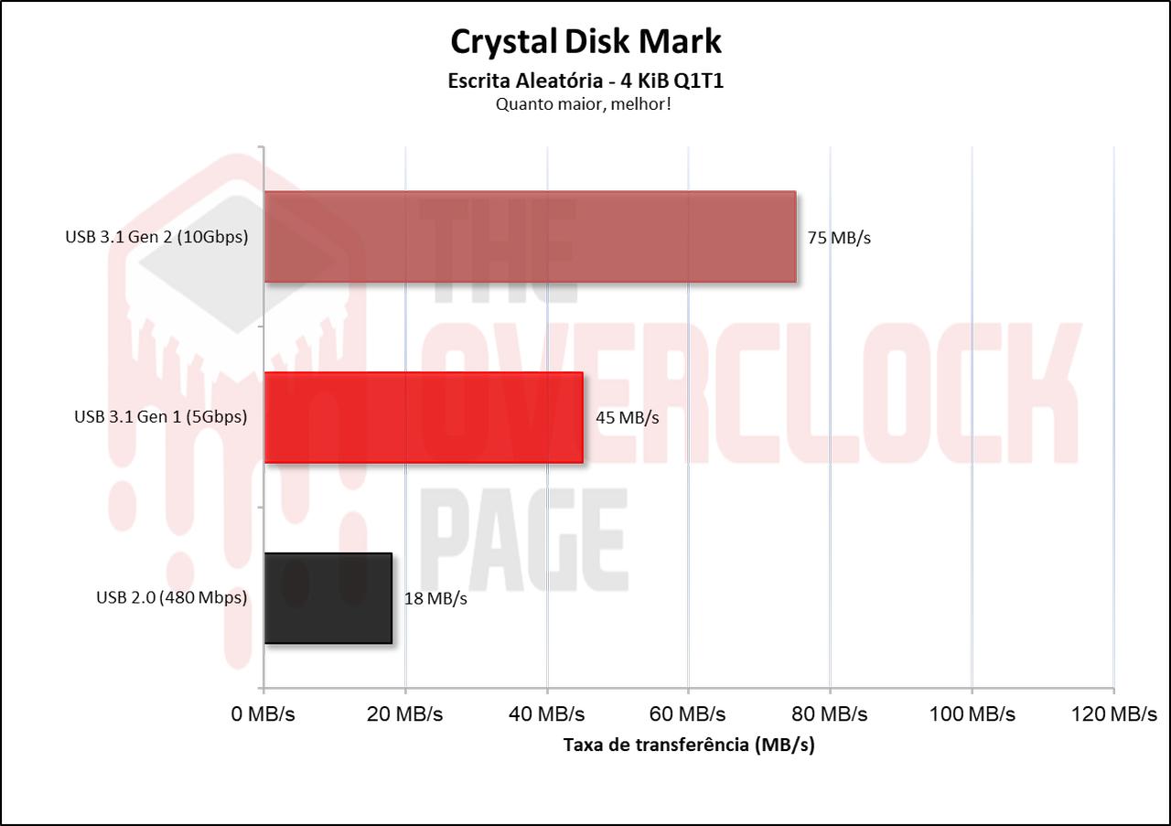 Como estamos testando uma case externa USB 3.1 10Gbps e muitas máquinas já possuem USBs capazem de atingir esse barramento, também foram incluídos resultados de comparação, com a enclosure conectada em uma entrada USB 3.0 (5Gbps) e USB 2.0 (480Mbps), para aqueles que não possuem tais conectores.