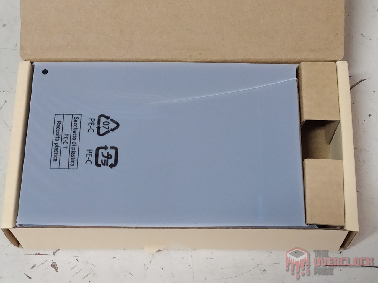 Esta enclosure vem em uma caixa de papelão na cor beje e com uma breve foto ilustrativa em sua parte frontal, enquanto atrás, temos informações técnicas do produto, e ao abrirmos vemos a case embalada em um protetor plástico.