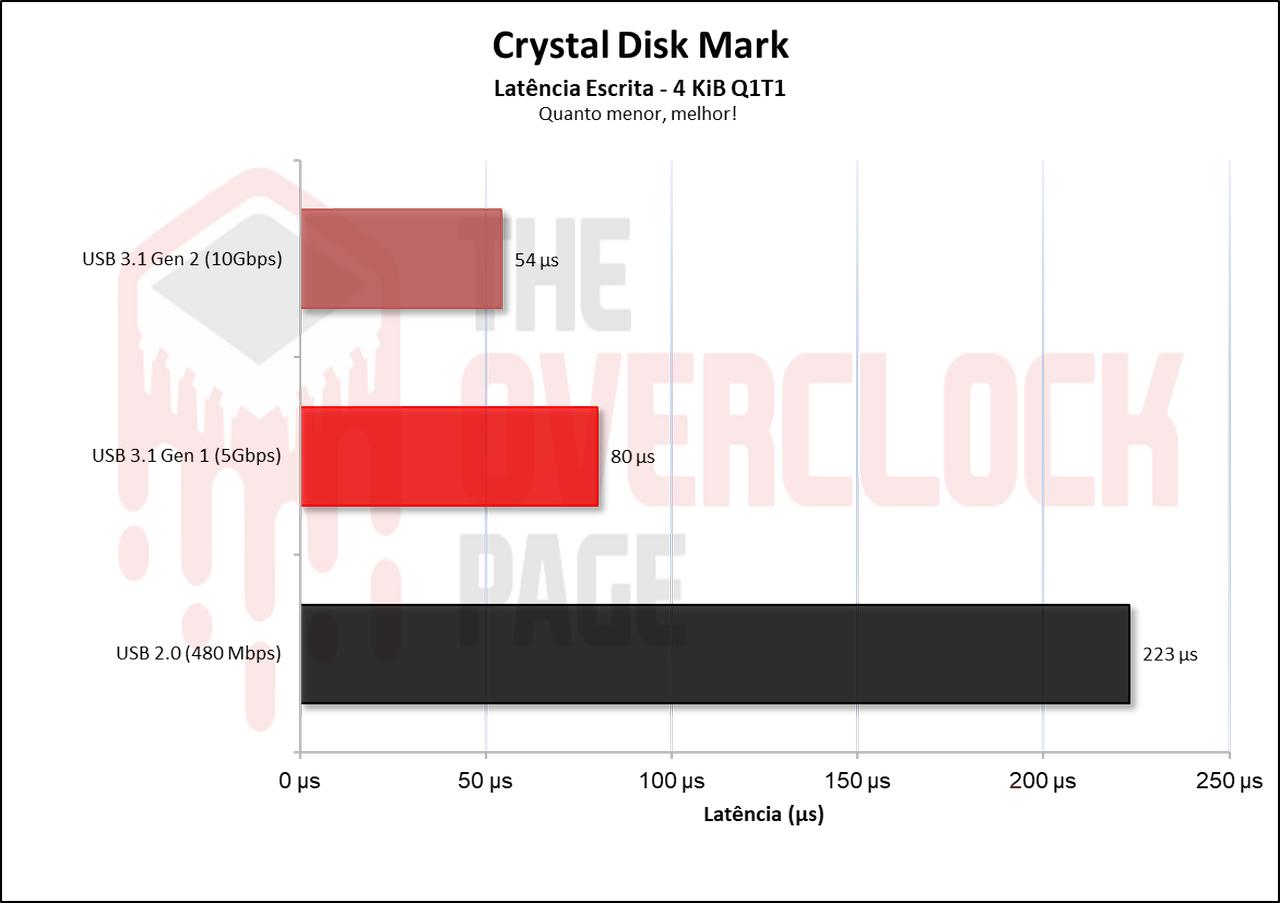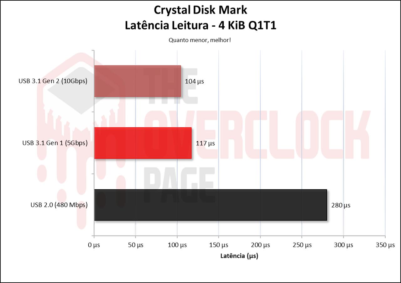 No quesito de latências, tanto em sua leitura quanto escrita não tiveram resultados ruins, e foram bem próximas quando conectados em USB de 10Gbps e 5Gbps. Suas latências aumentam muito apenas quando conectadas em USB 2.0, devido sua largura de banda ser muito inferior.