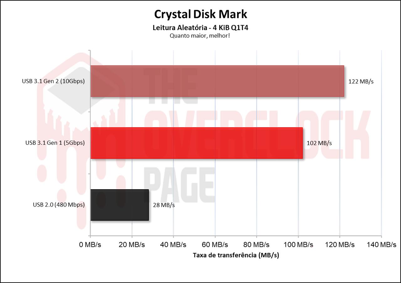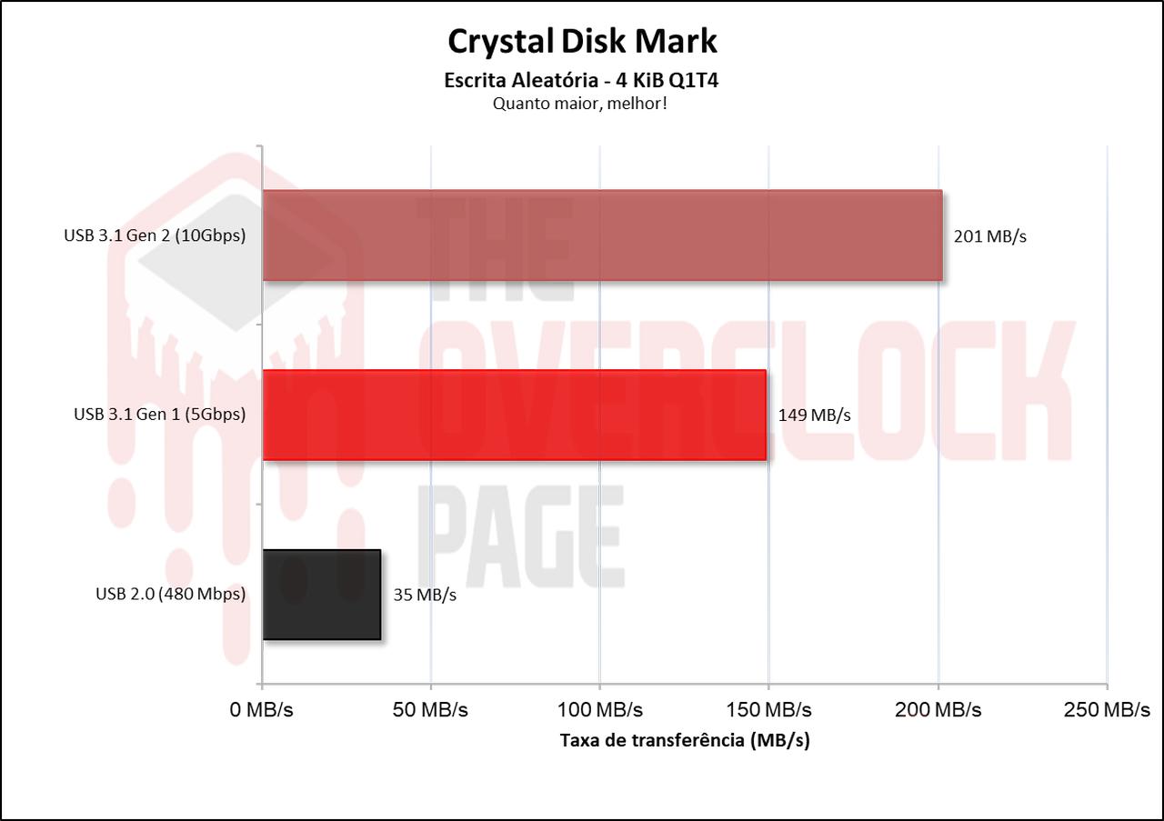 Já as velocidades aleatórias em QD4, foram similares no quesito de leitura quando conectadas em 10Gbps e 5Gbps, tendo uma maior diferença em sua escrita. Novamente vemos as portas USB 2.0 destruindo o desempenho do SSD Externo.
