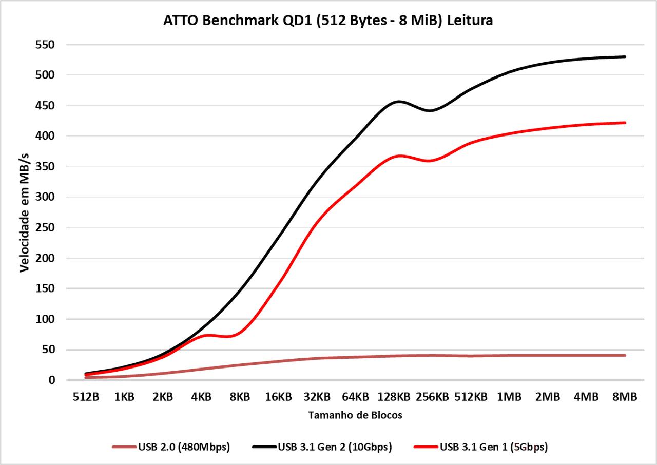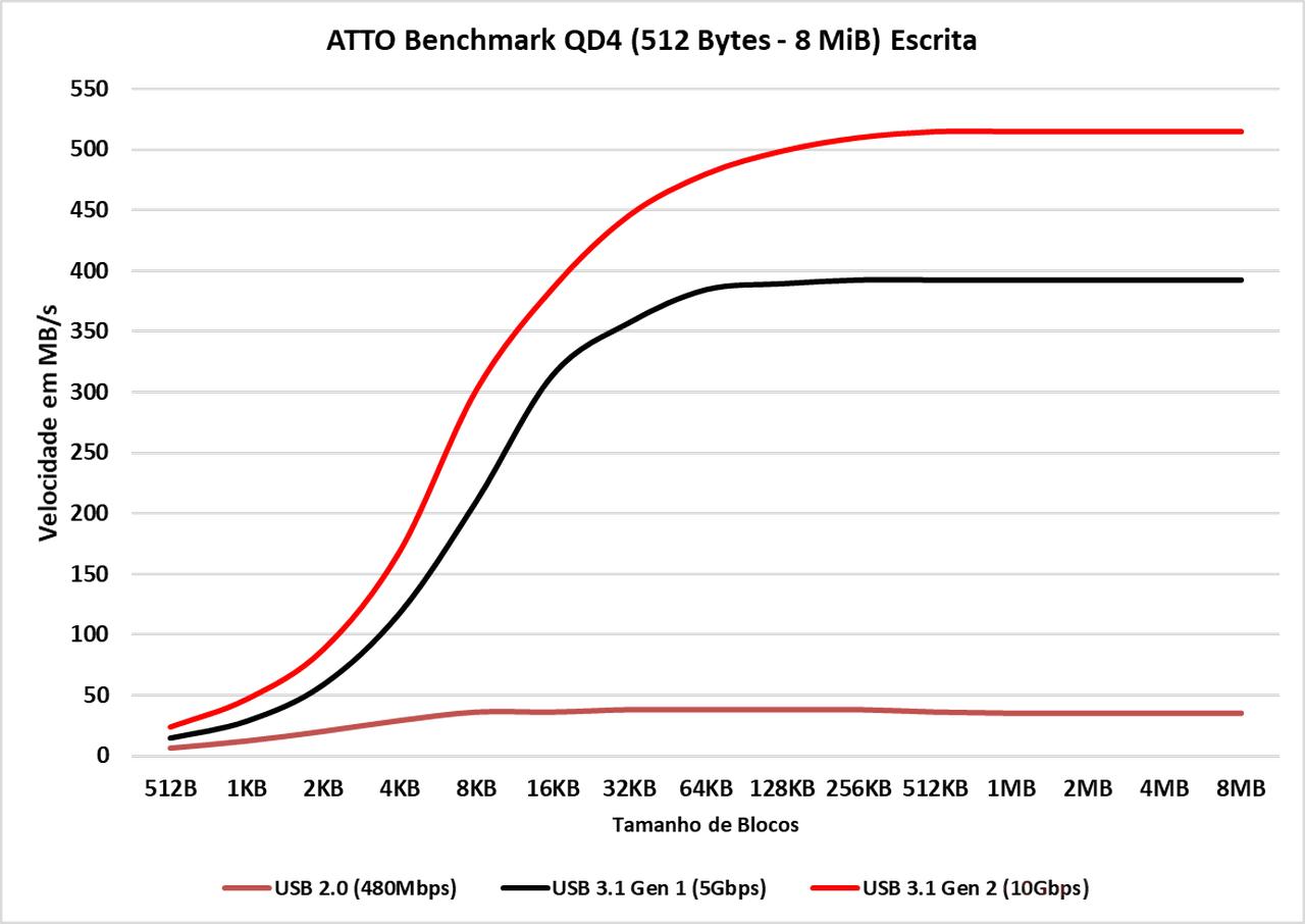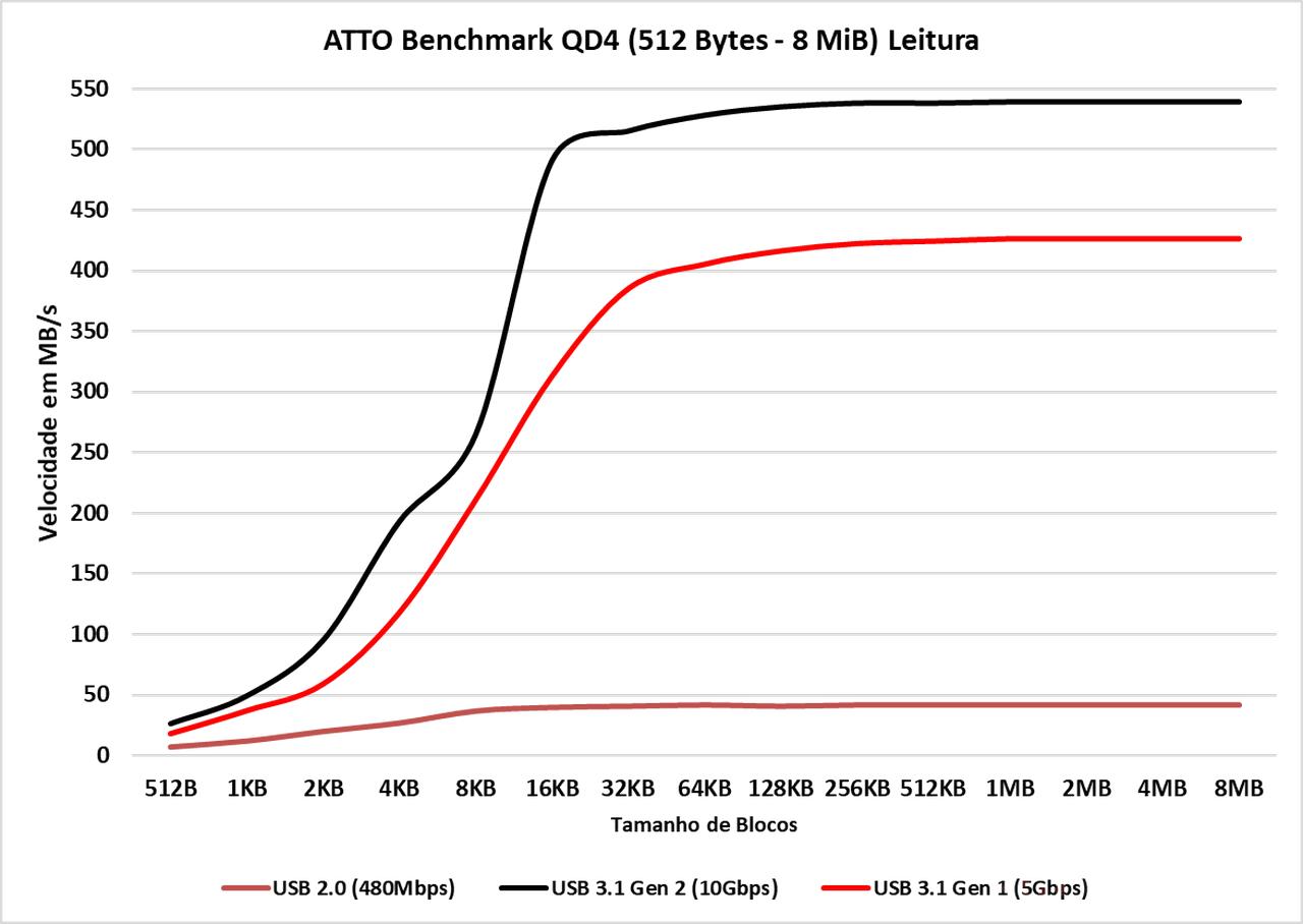 O ATTO Disk Benchmark é um software que faz um teste de velocidade sequencial com arquivos comprimidos, ou seja, para uma simulação em uma carga de transferência de dados como no Windows, geralmente vemos algo em torno dos blocos de 128KB à 1 MiB, agora, podemos observar que durante o teste em suas portas de 5 e 10 Gbps ele tem um desempenho satisfatório, enquanto ao estar em uma porta USB 2.0 o desempenho foi terrível.