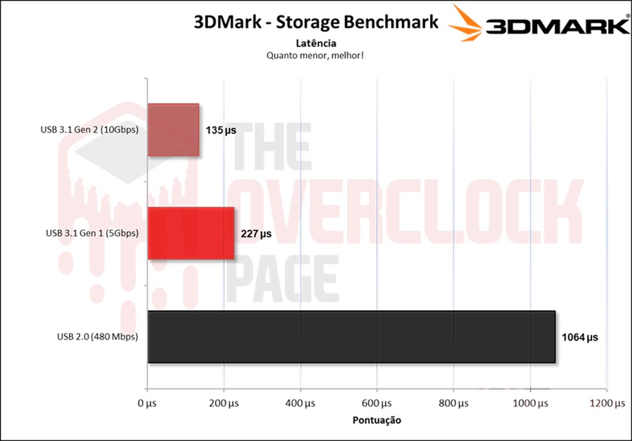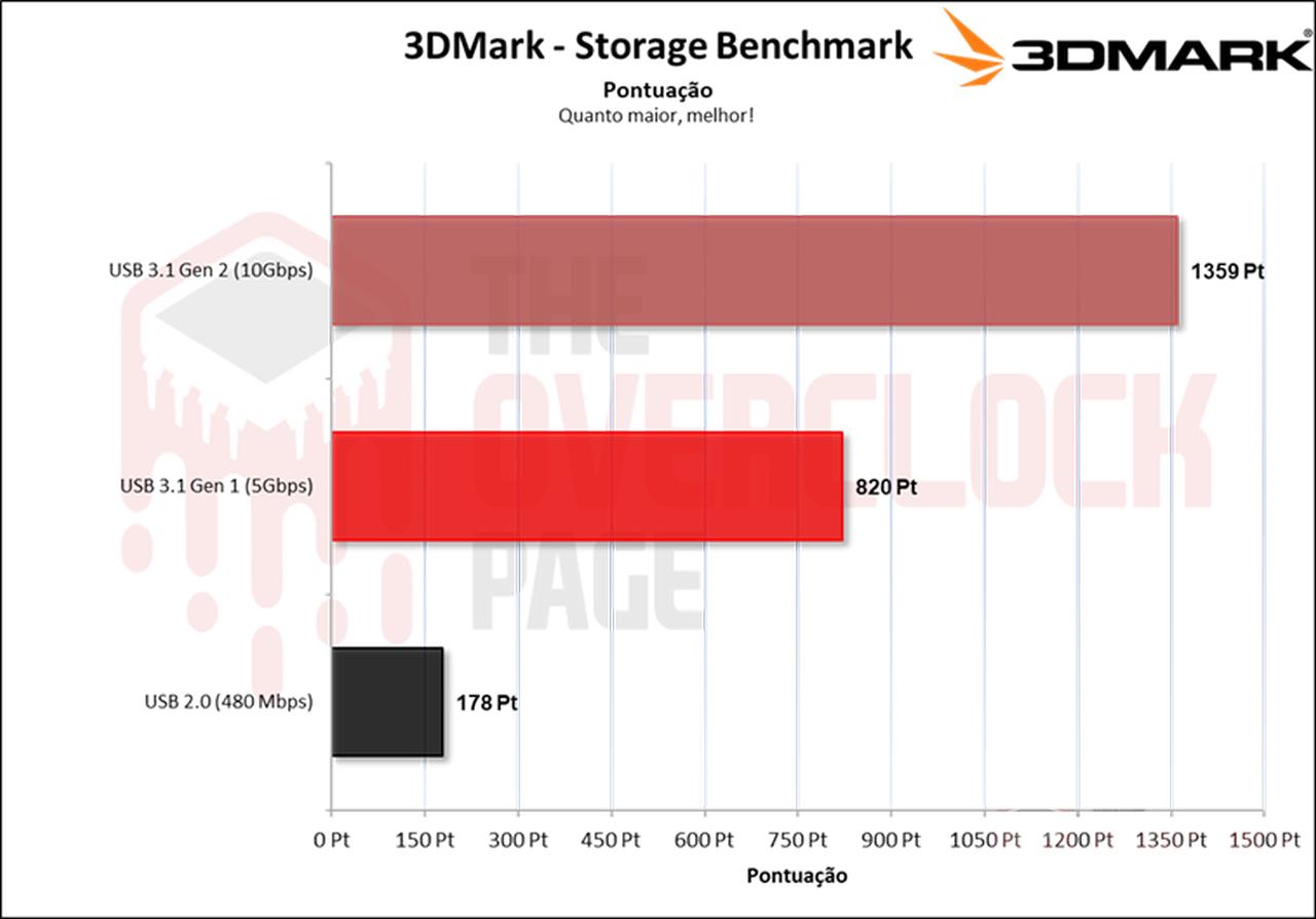 Este mesmo cenário se repetiu neste benchmark com foco em produtividade, aonde houve uma queda ao sairmos da USB de 10 Gbps para 5 Gbps, sendo de quase metade da pontuação, mas não foi tão gigante quanto a da porta USB 2.0.