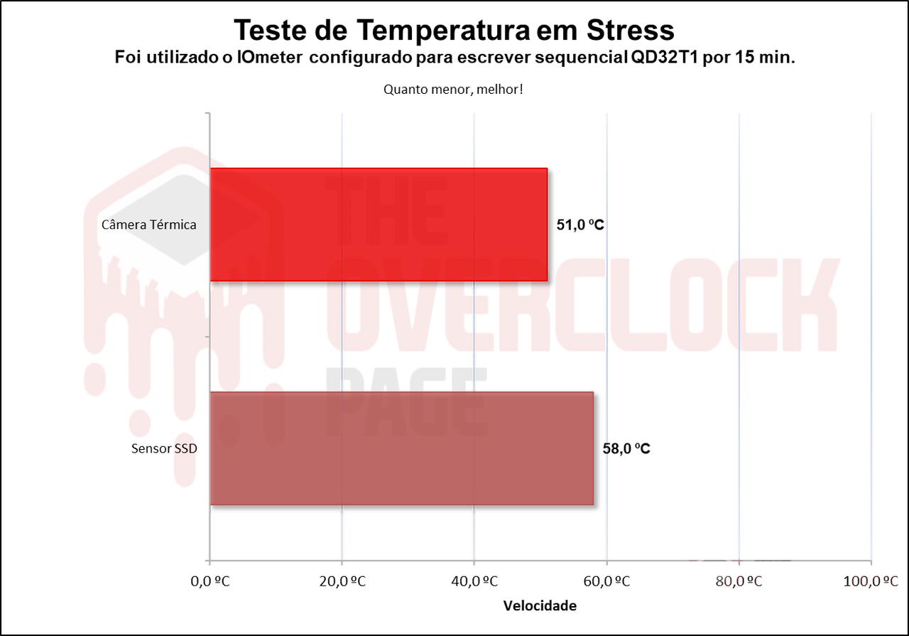 Neste trecho da análise, observaremos a temperatura do SSD durante um teste de stress, onde o SSD recebe arquivos de forma contínua, para podermos saber se houve algum thermal throtling com seus componentes internos que pudessem gerar algum gargalo ou perda de desempenho.