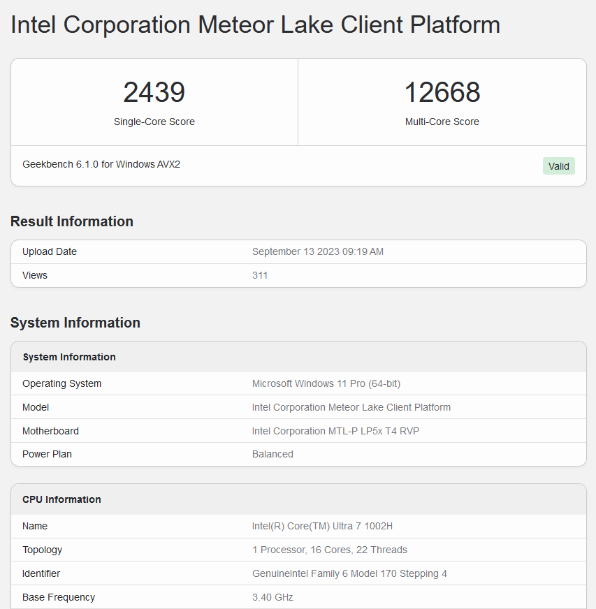 Benchmark do Intel Core Ultra 7 1002H “Meteor Lake” aparece